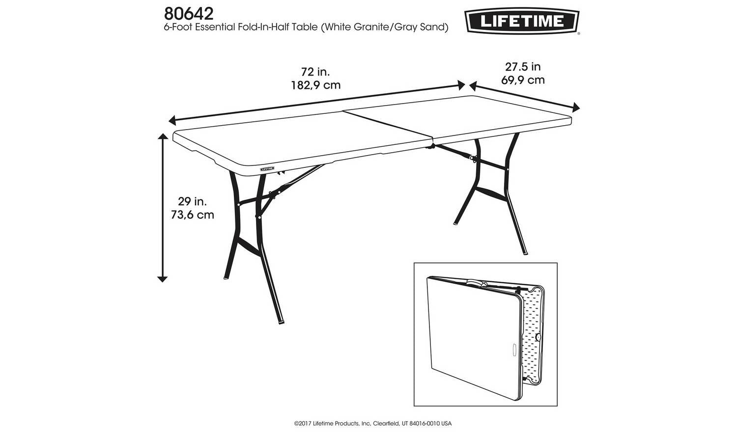 Table size H73.6, L182.9, D69.9cm (when folded H8.2, W91.4, D76.2cm).