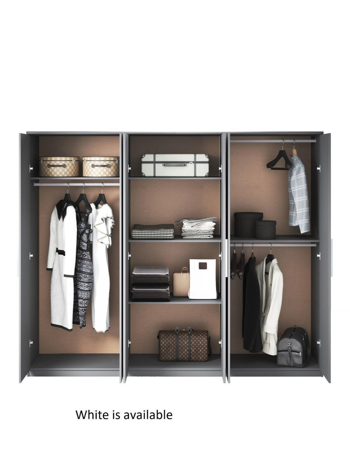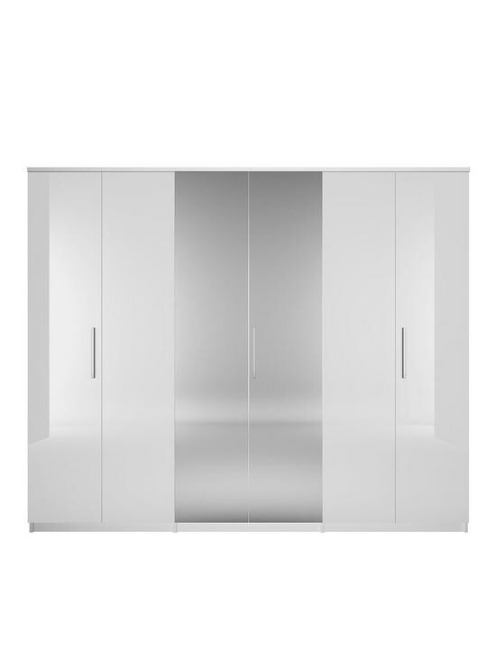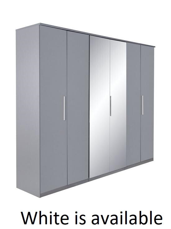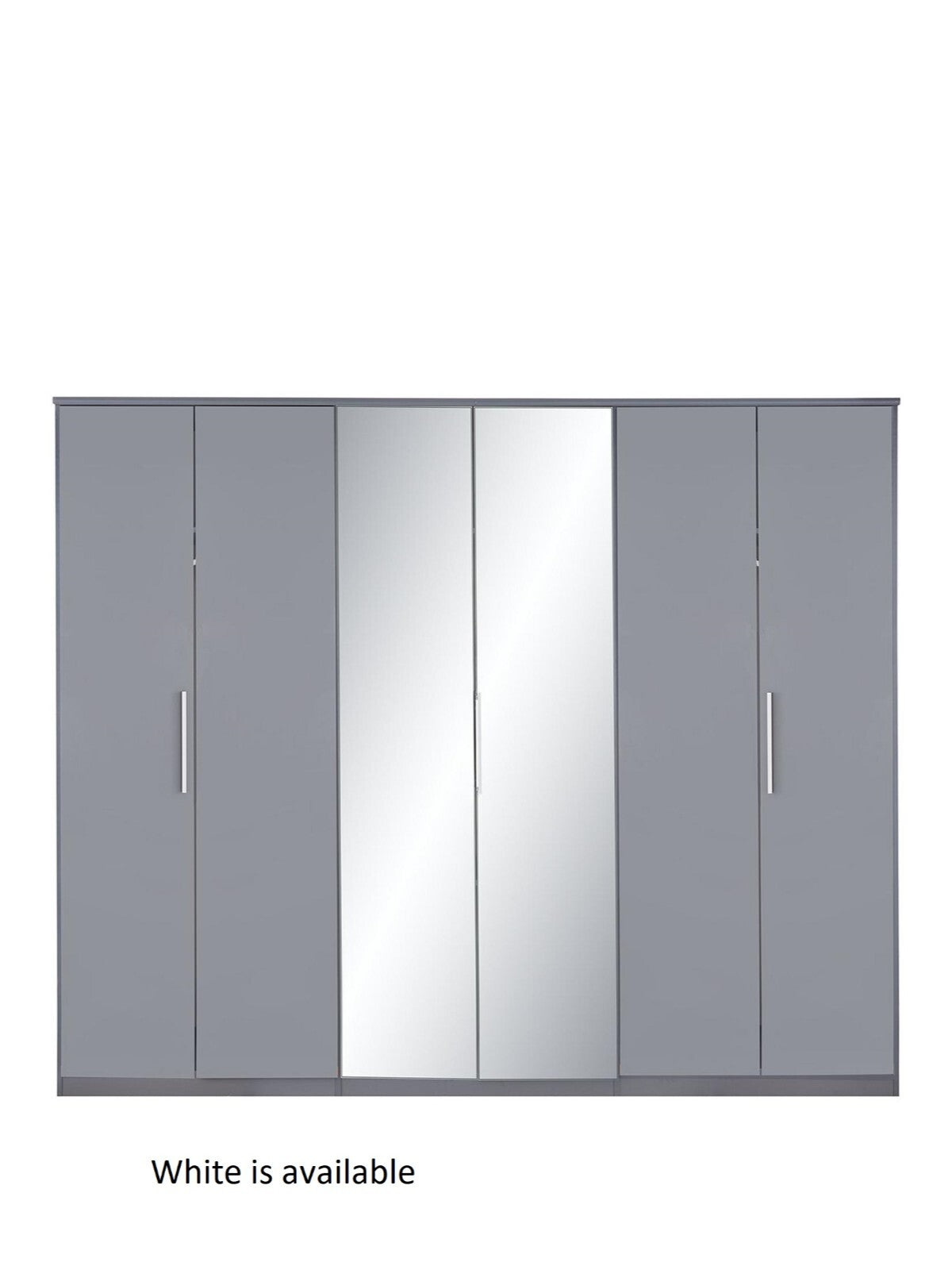 Prague High Gloss White 6 Door Mirrored Wardrobe with Hanging Rail & Shelves