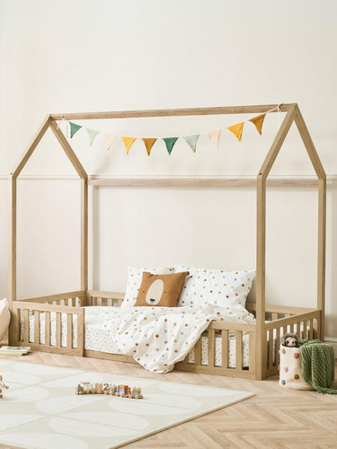 Empower your toddler with the Grande Casa Montessori Floor Bed in light oak. Designed to foster confidence and independence, this charming house-shaped bed sits low to the ground, allowing your child to get in and out safely on their own. Crafted from MDF and plywood, it creates a secure, playful sleeping environment that makes bedtime an engaging and positive experience, perfectly easing the transition from cot to big kid bed.