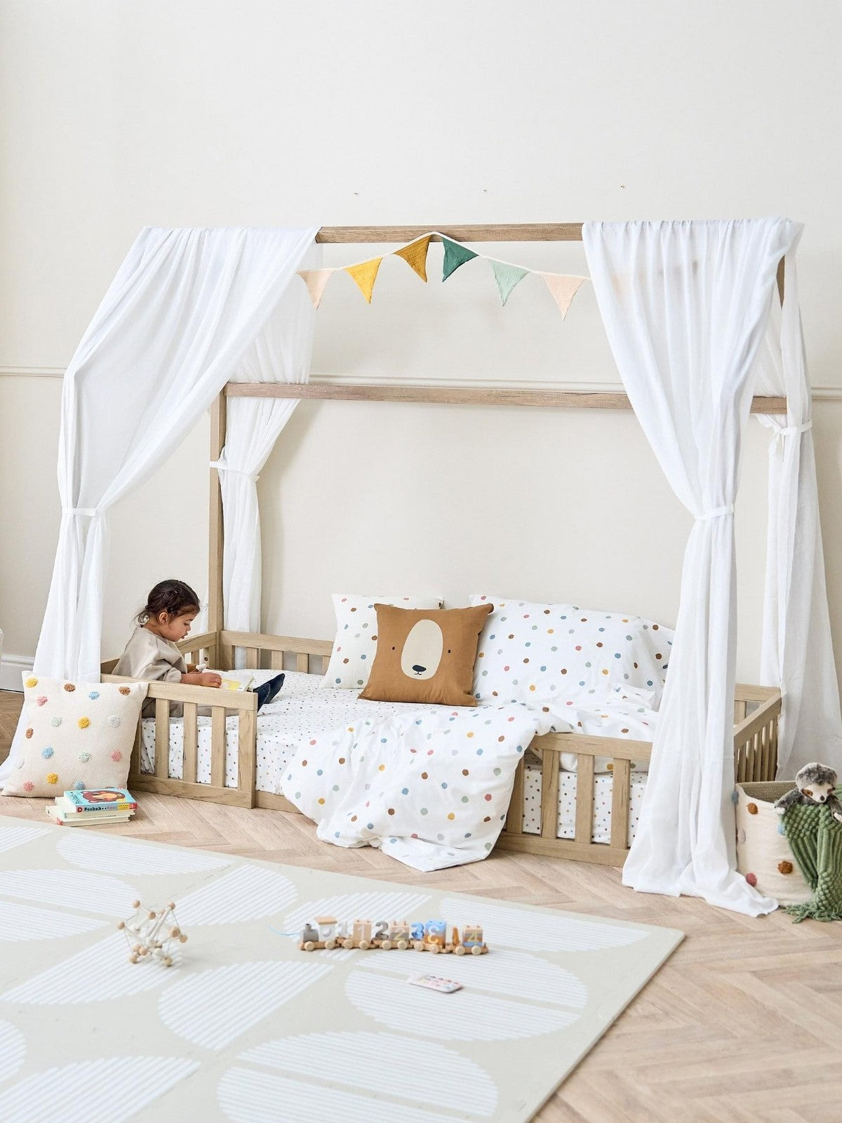Low-to-ground frame empowers toddlers to enter and exit bed safely without assistance