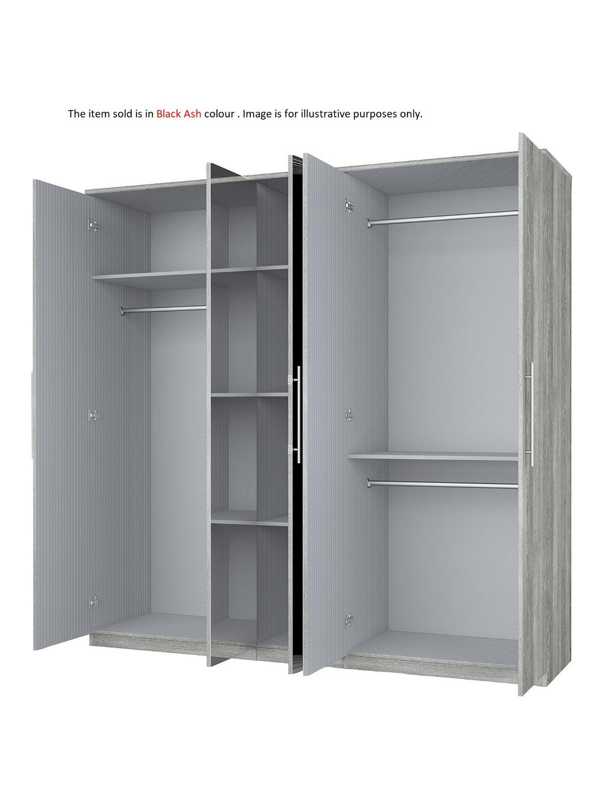 Available in black ash, its middle three doors are mirrored to splash your sleep space in light and depth. One side has a hanging rail for longer items plus an upper shelf, while the other has a further 2 rails (one on top of the other), providing twice the hanging space for shorter items.