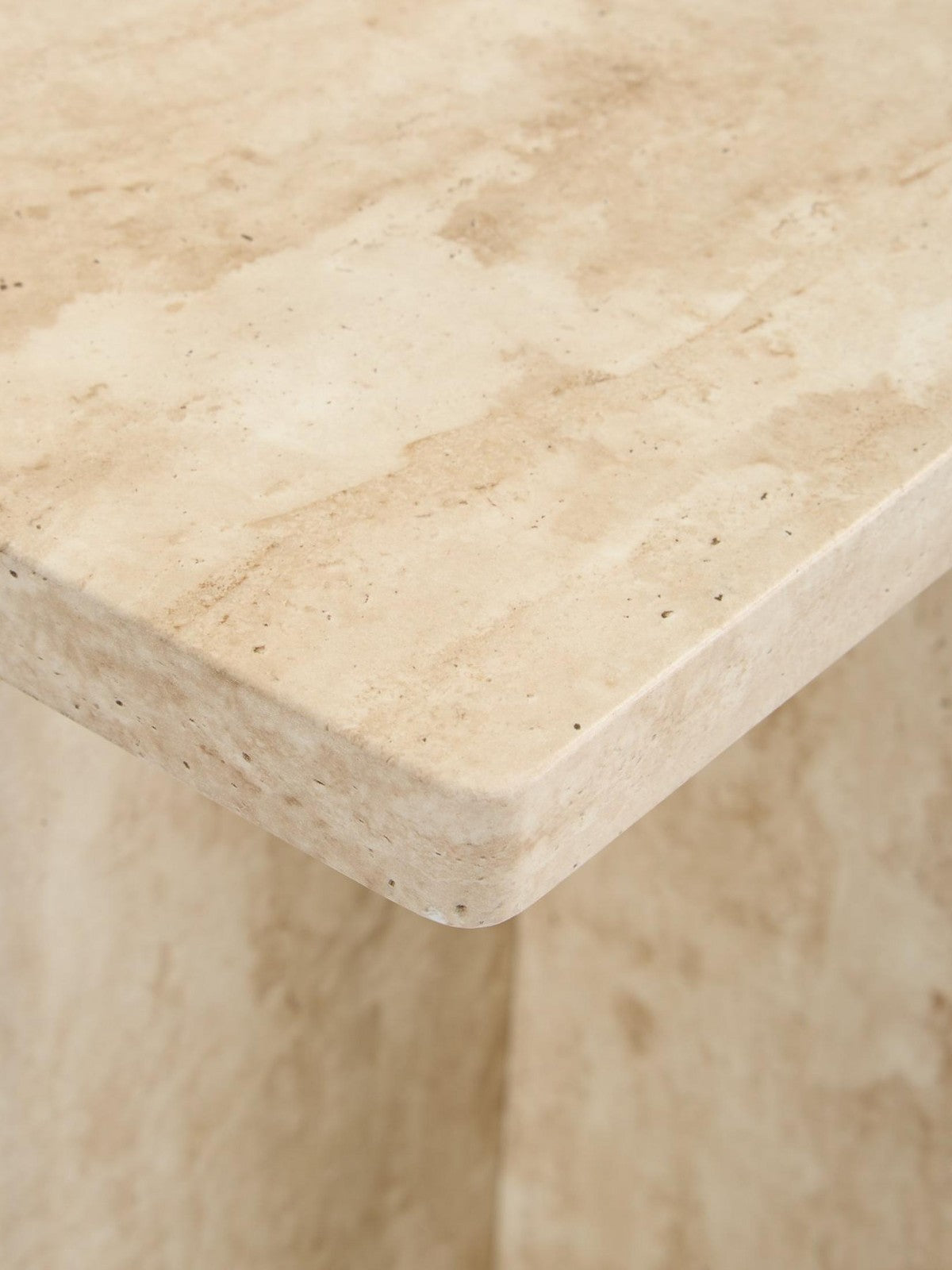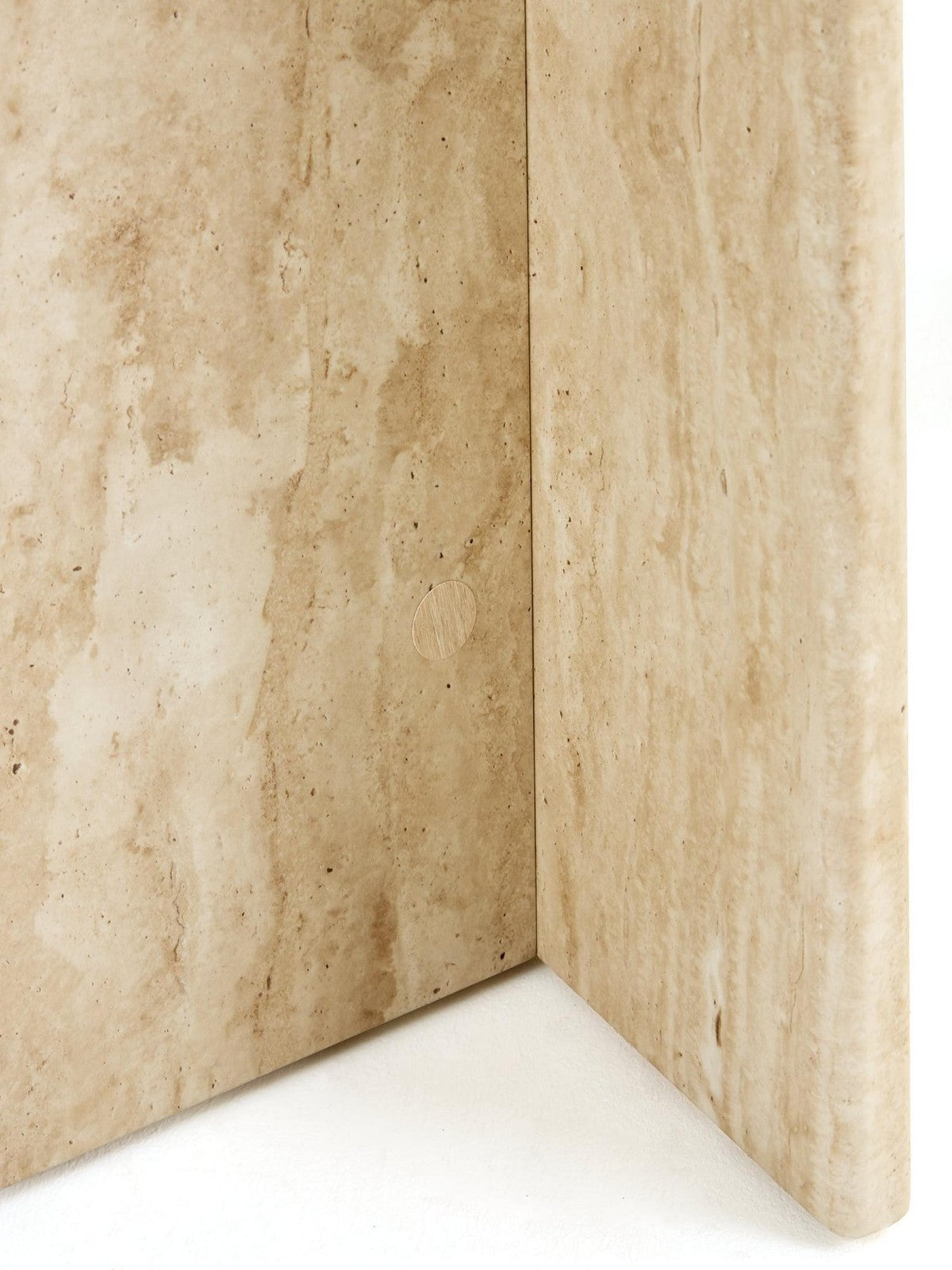 Simply styled, the eye-catching look comes from a warmly coloured travertine stone-effect which features an intricate collection of patterns. Rounded corners and edges give it a smooth finish, while the table top is supported by a stylish right angle legs.