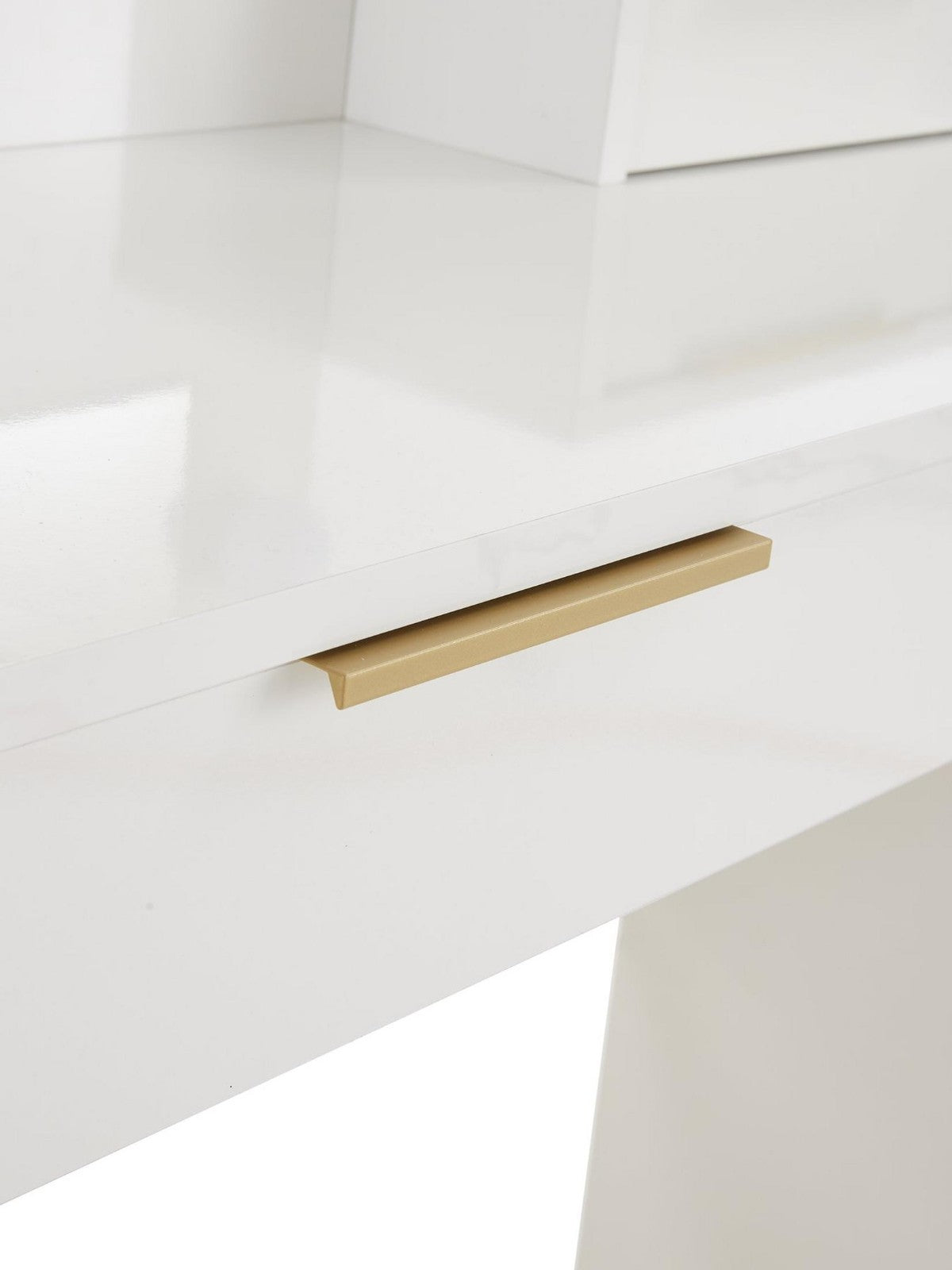 Elevate your beauty routine with the Bessy gloss white dressing table. Its high-gloss finish brilliantly attracts light, while the included mirror features integrated lighting for flawless makeup application and hairstyling. Offering ample storage with one large drawer and two smaller top drawers for accessories and jewellery, this complete vanity set combines glamour with practical organisation. Self-assembly required.