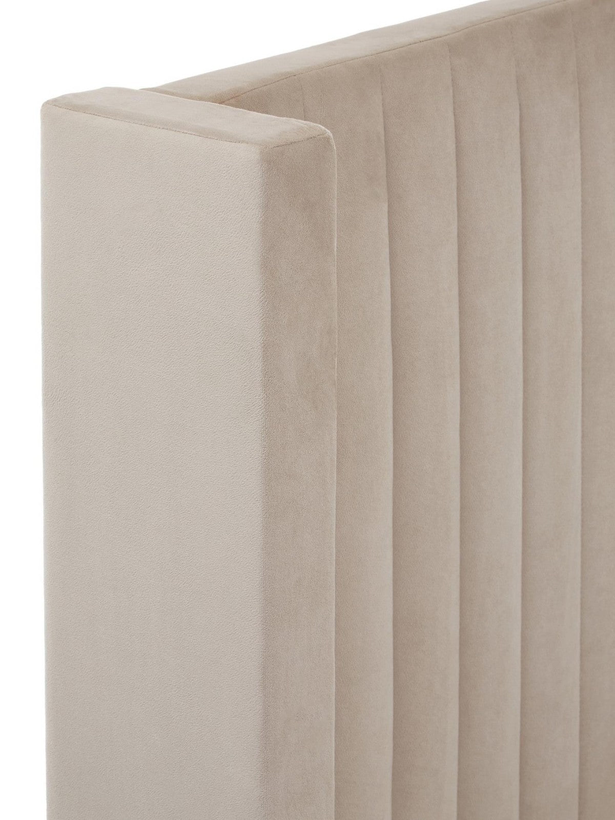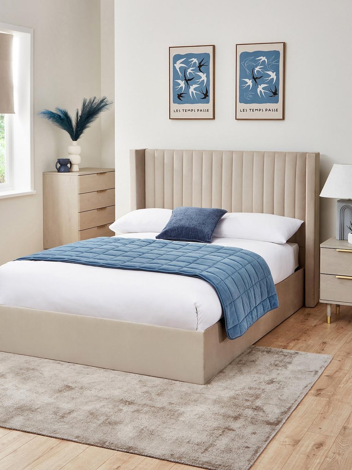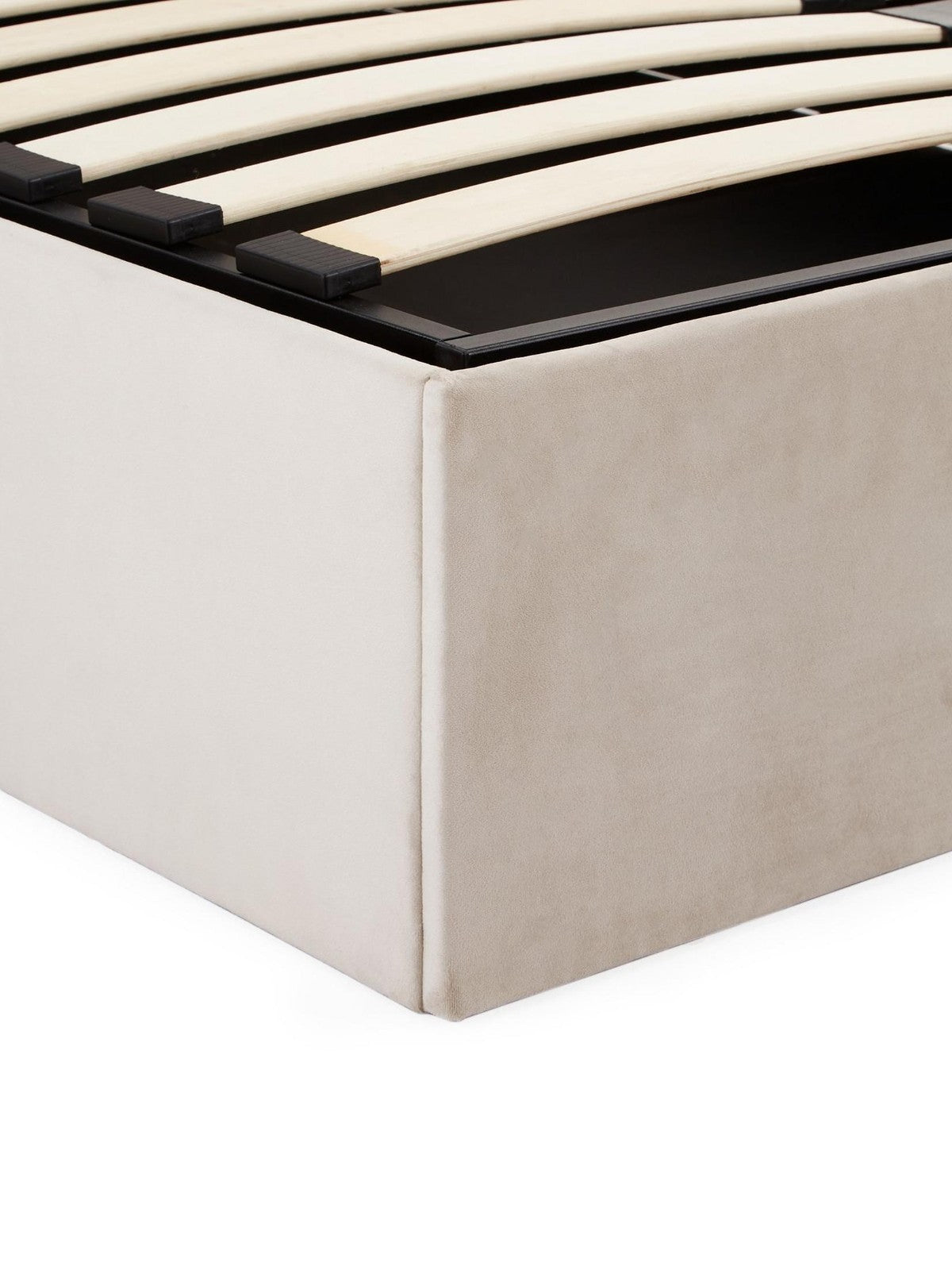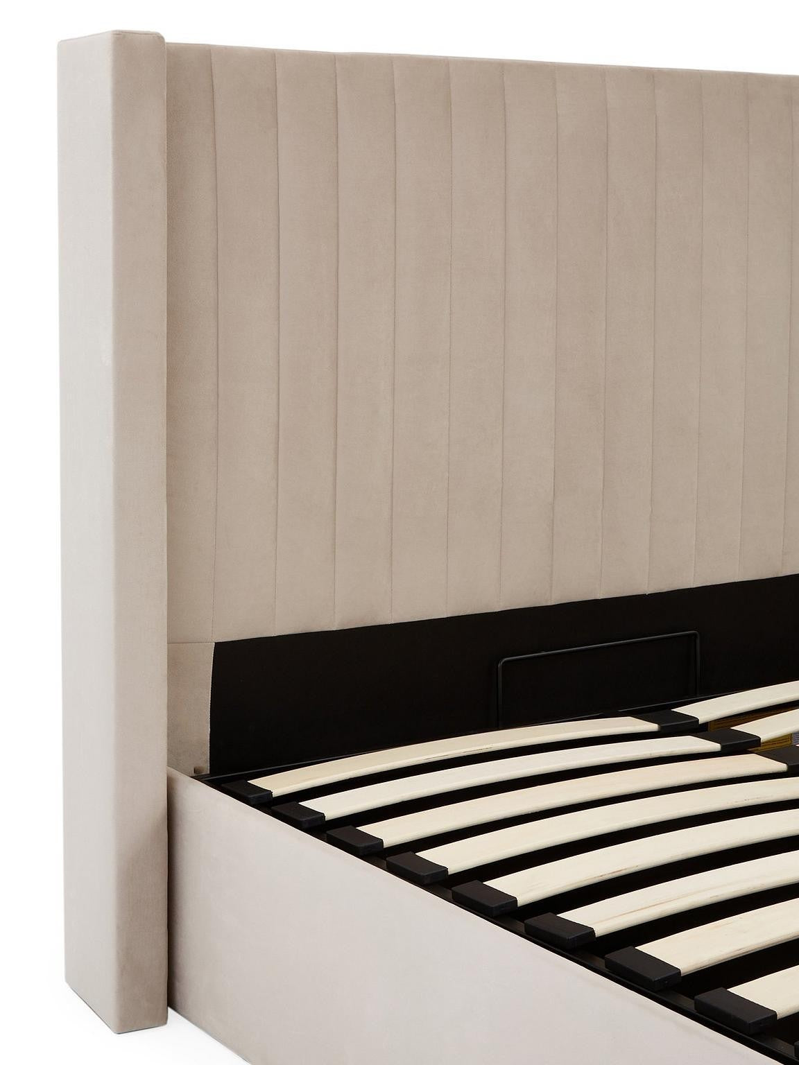 The Haywood Double Ottoman Bed in soft natural fabric combines contemporary style with practical under-bed storage. Featuring a detachable winged headboard with vertical stitching and convenient end-lift mechanism, this bed offers both sophisticated design and smart organization for modern bedrooms.