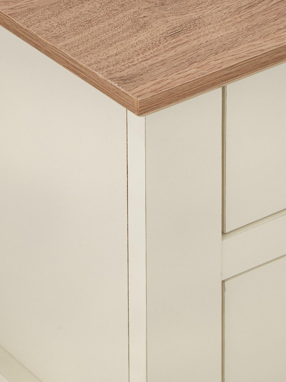 The soft ivory hue is contrasted by rustic oak effect tops that flaunt a wonderfully realistic grain, and each piece is accented with shiny metal cup handles.