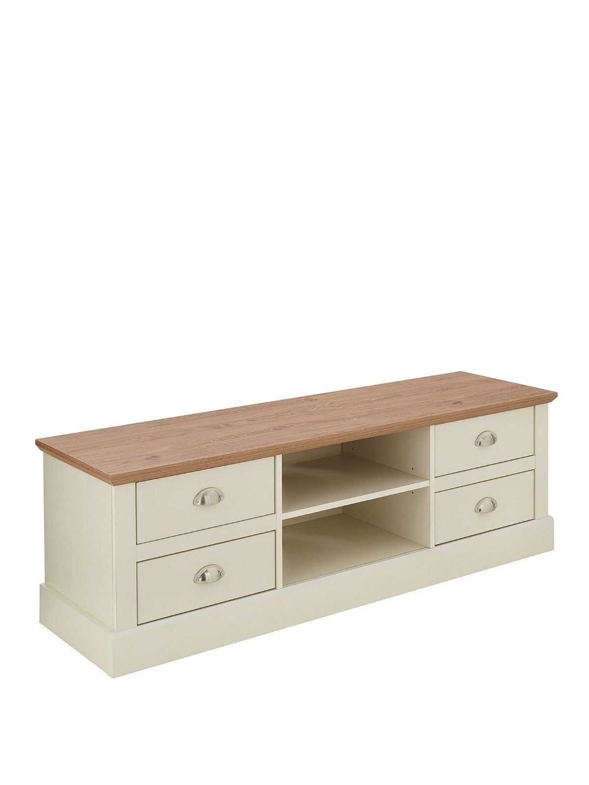 The TV unit suits televisions with a screen size up to 55 inches, while open shelving for your peripherals is complemented by four storage drawers - ideal for stowing away all those DVDs and video games. There's also cable management cut-outs to keep wires neat.