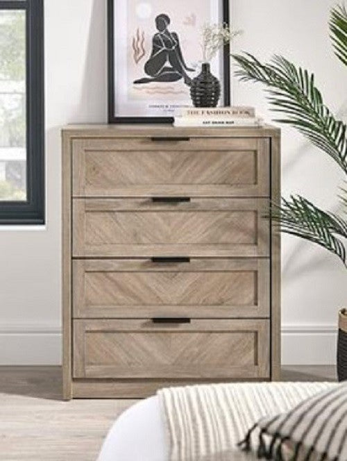 Chevry 4 Drawer Chest Grey Oak Fishbone Pattern Modern Storage