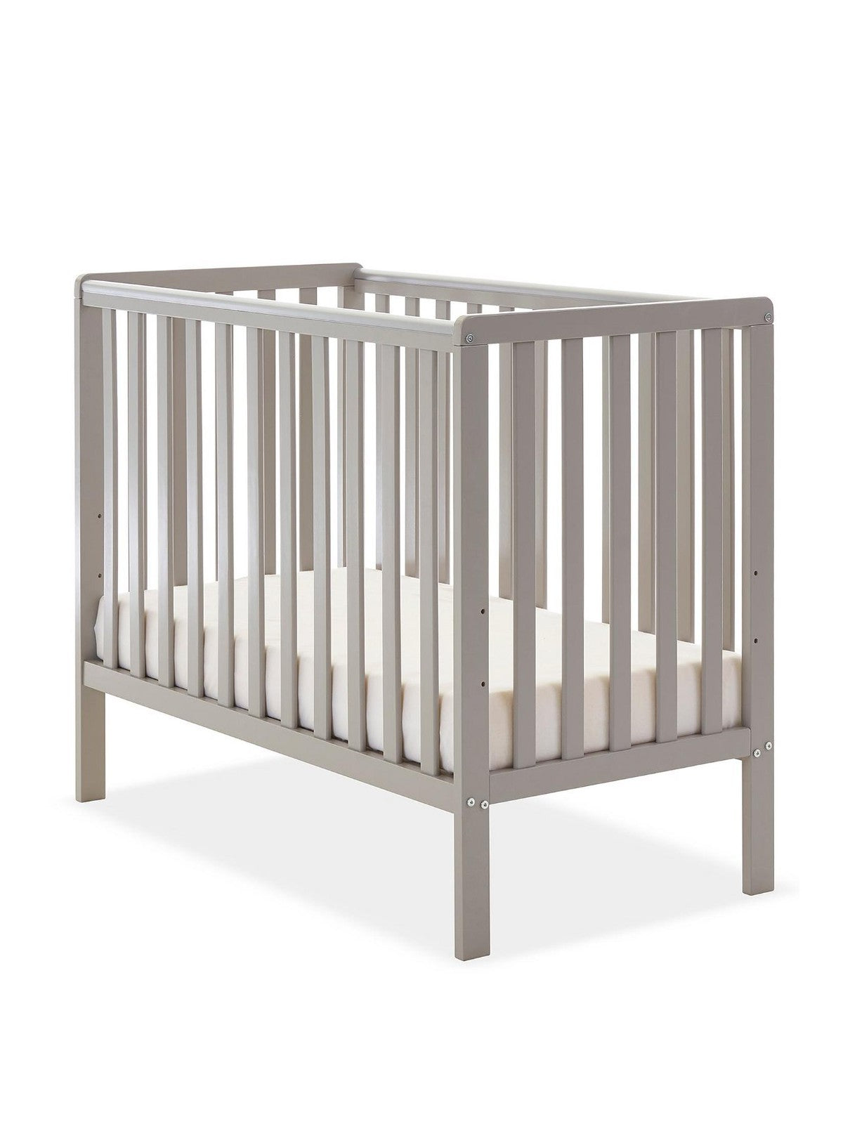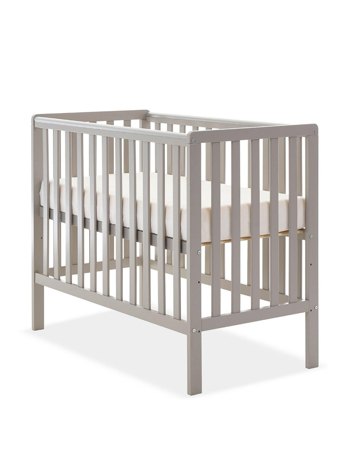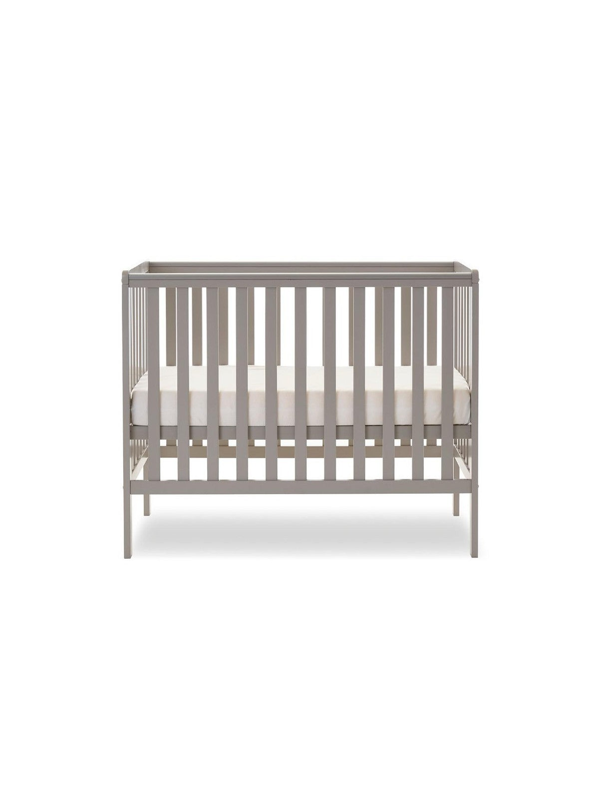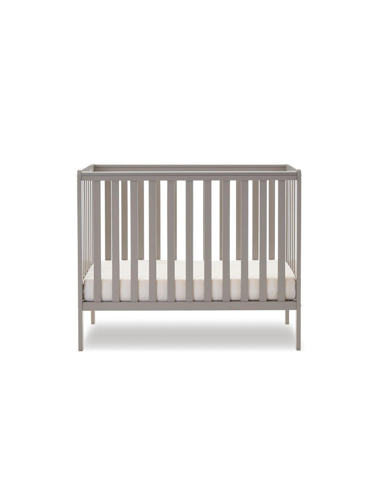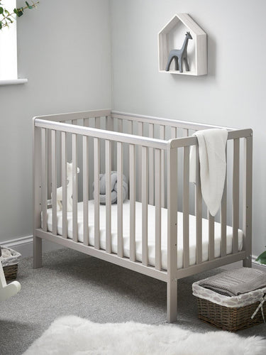 The Obaby Bantam Space Saver Cot in warm grey offers full-size functionality in a compact design, perfect for smaller nurseries. Crafted from 100% New Zealand pine with protective teething rails and three adjustable base heights, this cot provides a safe, comfortable sleeping space from birth to approximately 18 months while maximizing room layout efficiency.
