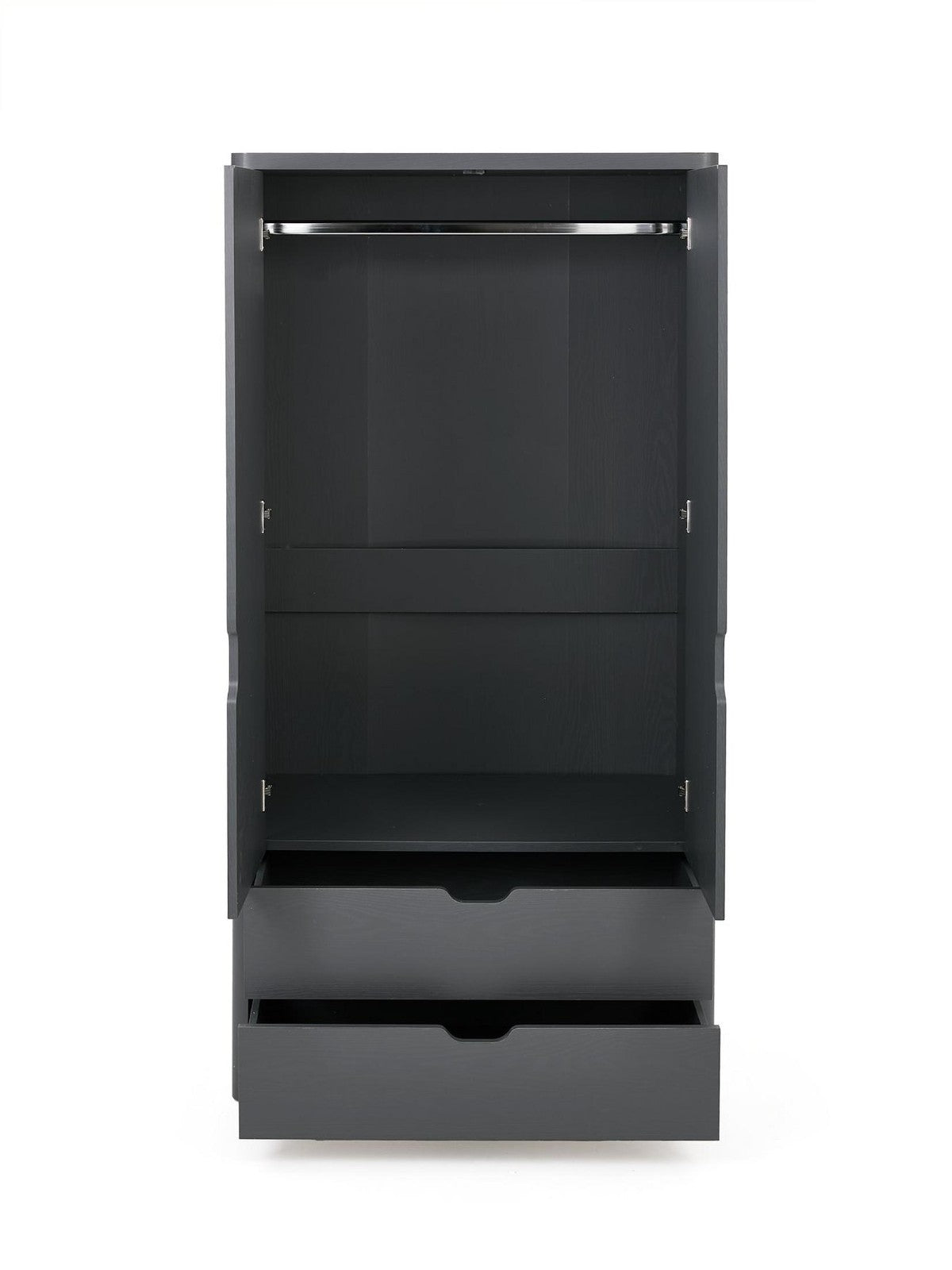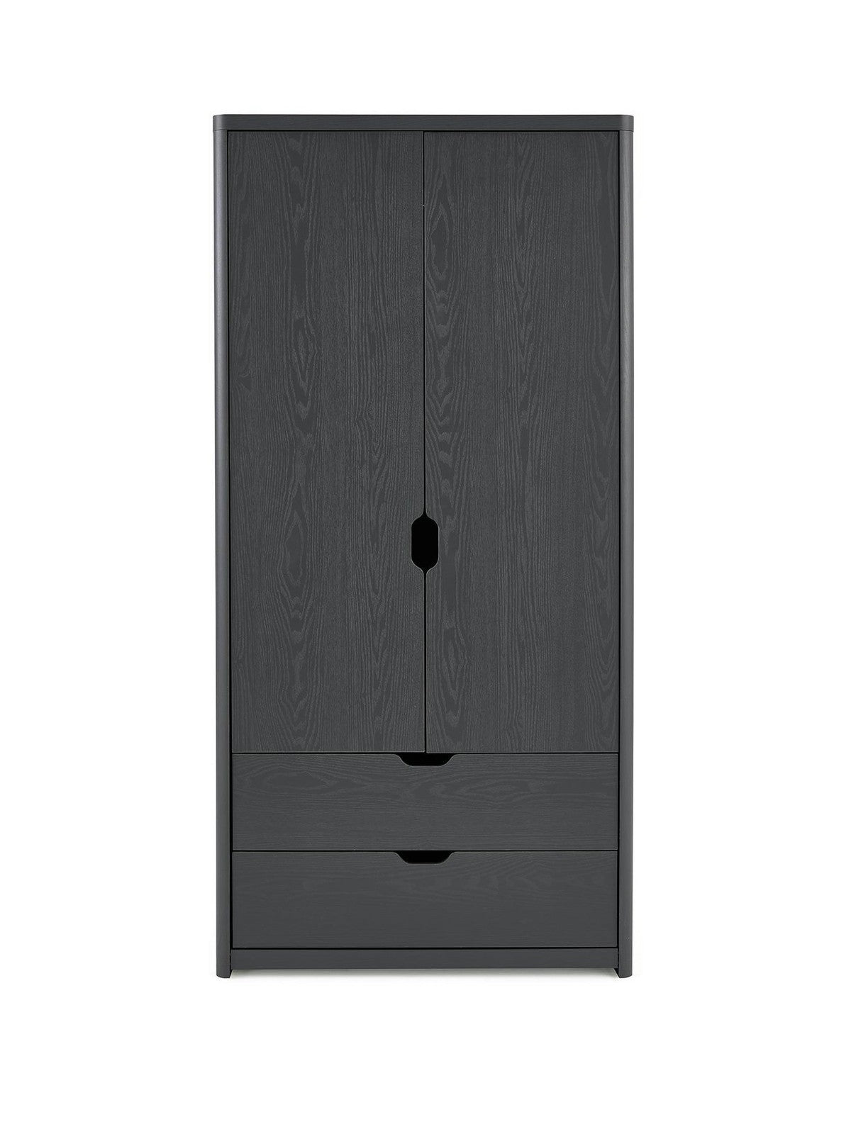 Bridge the gap between kids' furniture and adult style with the Aspen Wardrobe in a sophisticated dark grey oak-effect. Designed with smooth curved corners and distinctive angled cut-outs on the doors and drawers, this contemporary piece offers a mature aesthetic perfect for teens, tweens, or even adult bedrooms. Inside, a matching wood-effect finish and a metal hanging rail are complemented by two smooth-gliding drawers, providing organized storage that grows with your child.