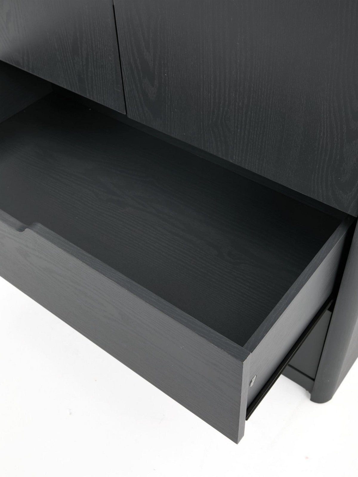 Smooth rounded corners and unique angled cut-outs on doors/drawers add modern flair