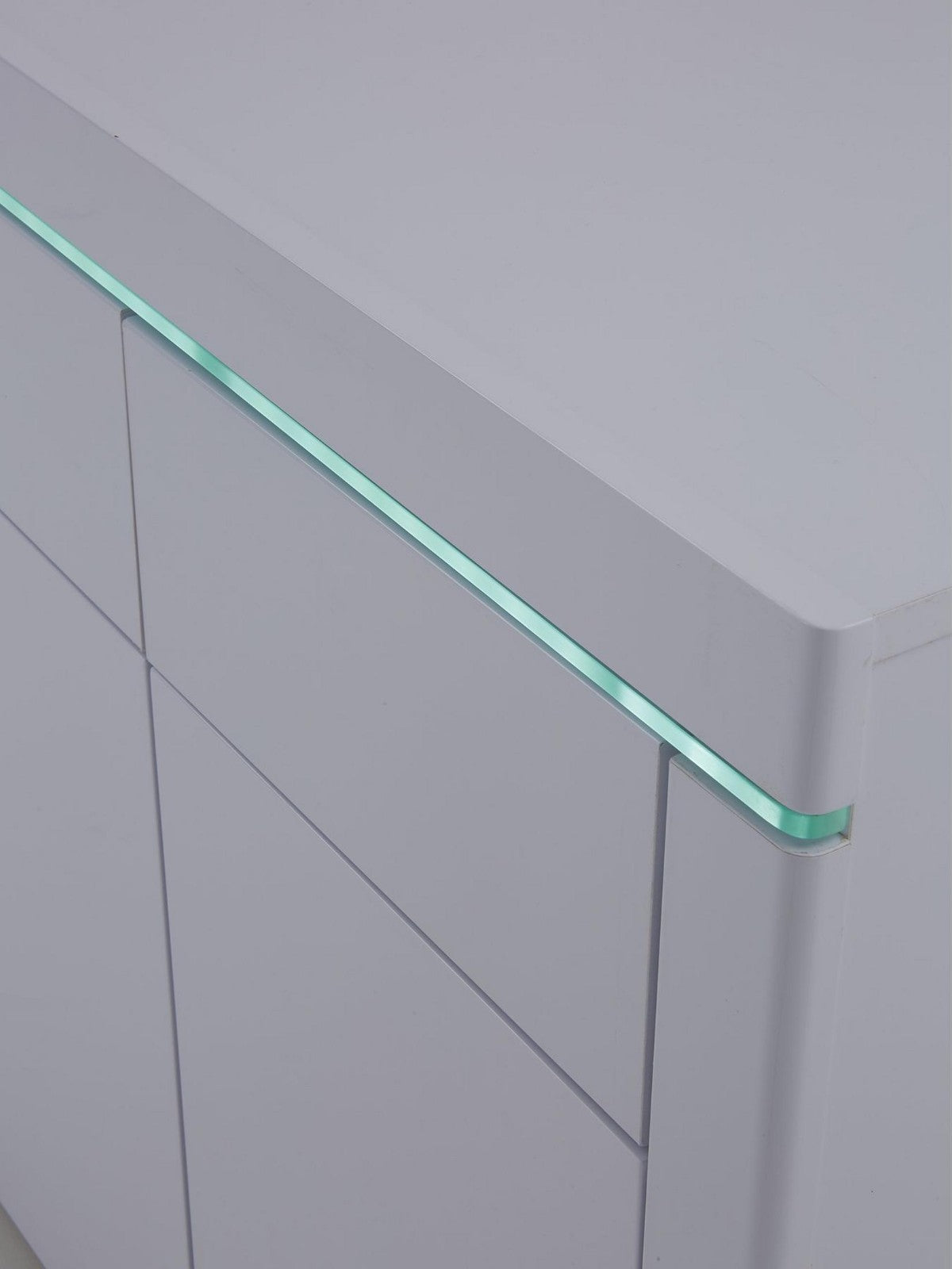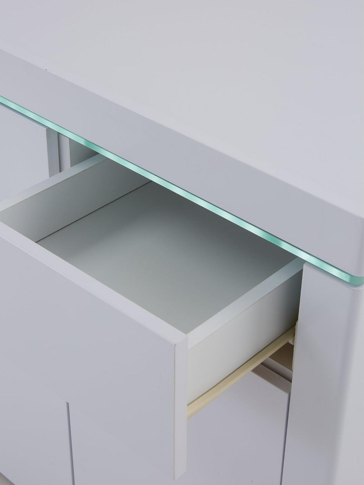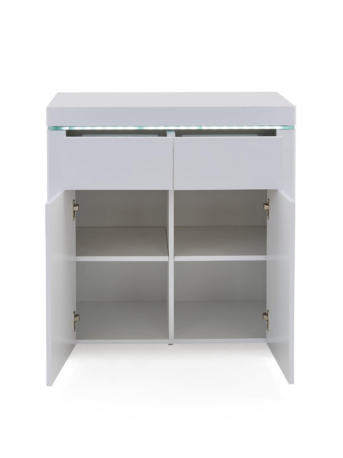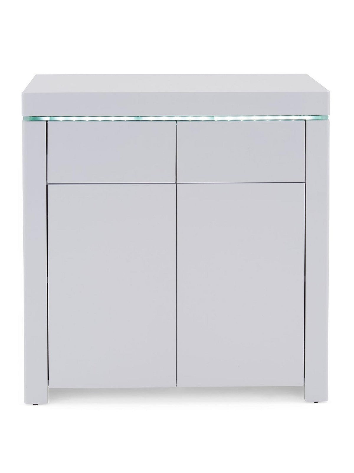 Illuminate your space with style using the Atlantic Compact Gloss Sideboard in brilliant white. This modern piece features a super-shiny high-gloss finish, enhanced by a captivating full-width LED light strip that brings it to life in the evening. Perfect for smaller rooms, its handle-free, push-to-open design maintains a seamless look, while inside, two doors with a shelf and two smooth-gliding drawers offer clever, organized storage for your essentials.