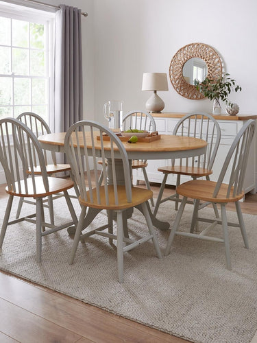 The chairs feature a spindle back design, adding to the table's traditional appeal. The seats are made from rubberwood, creating a striking contrast against the grey frames.