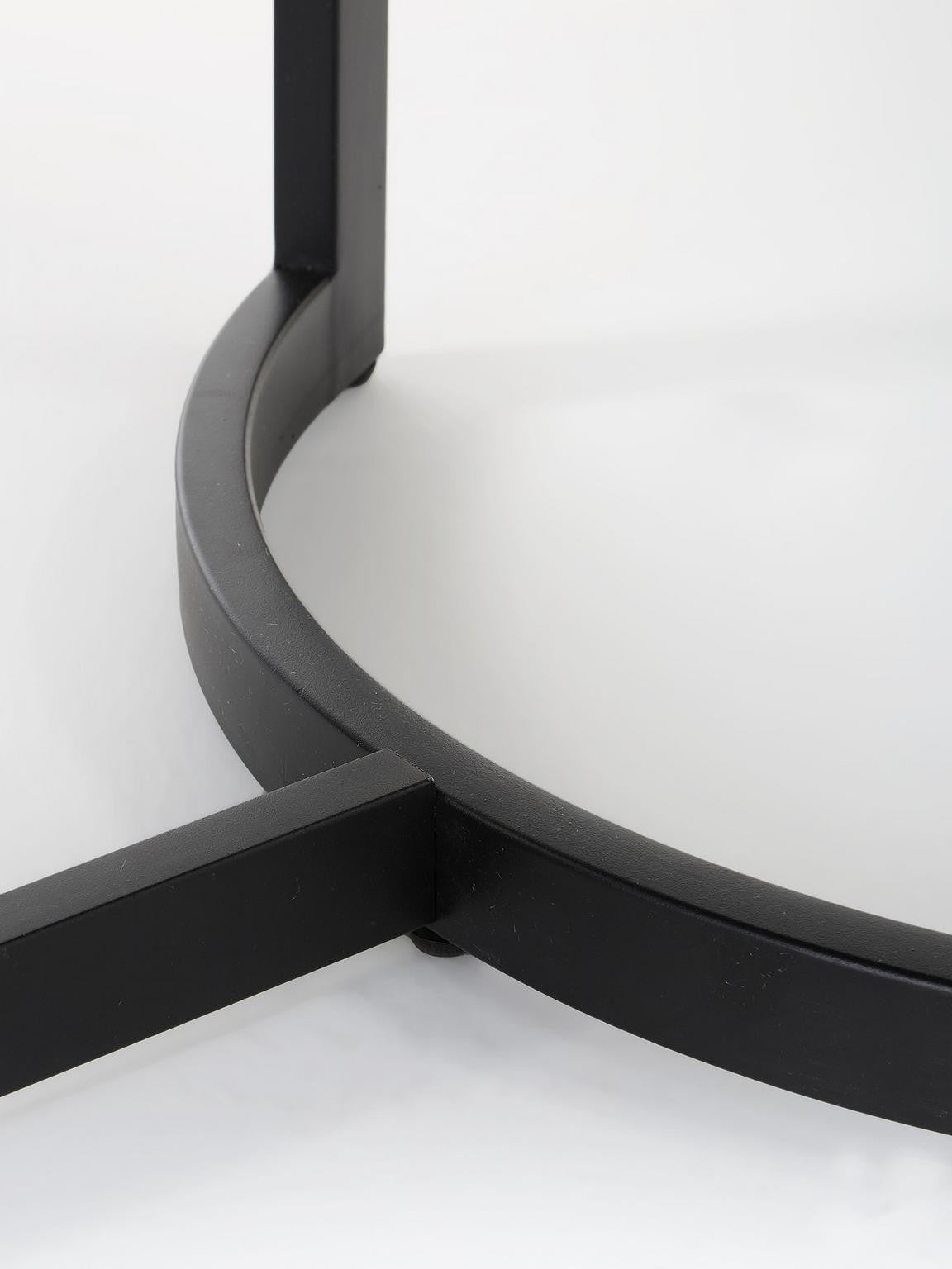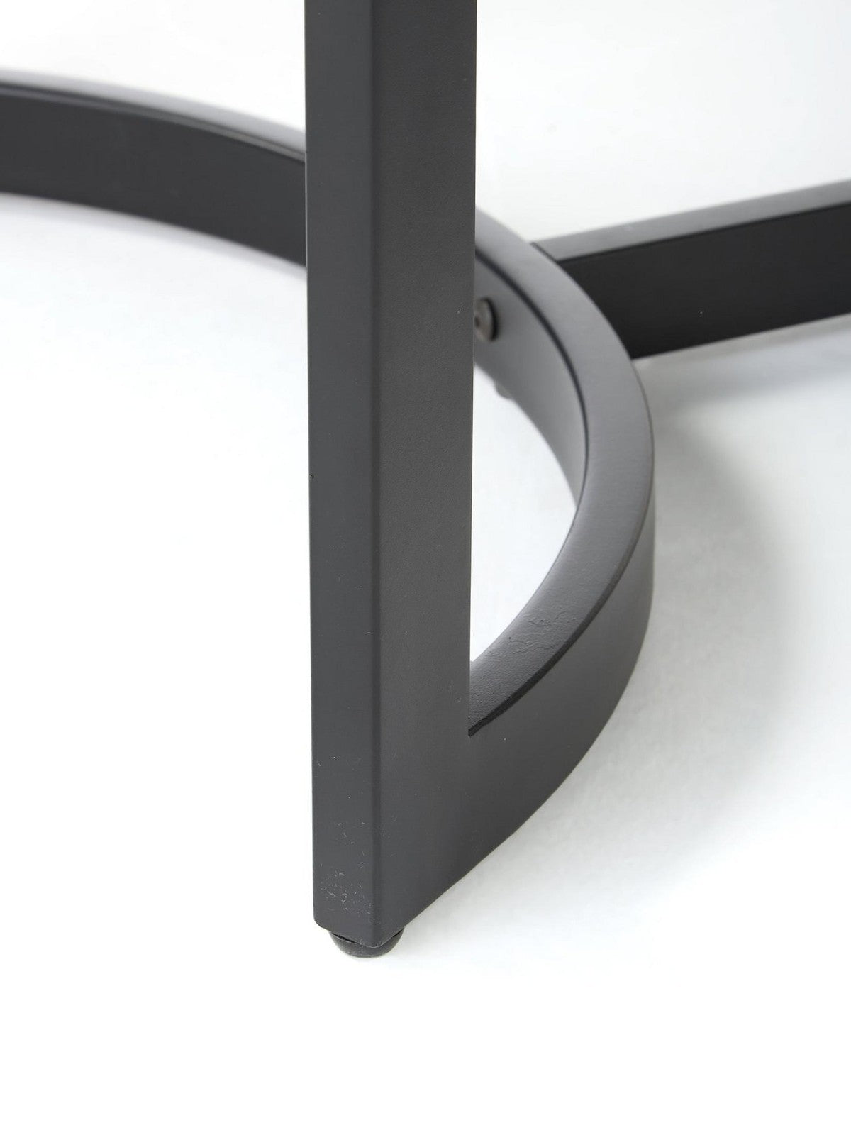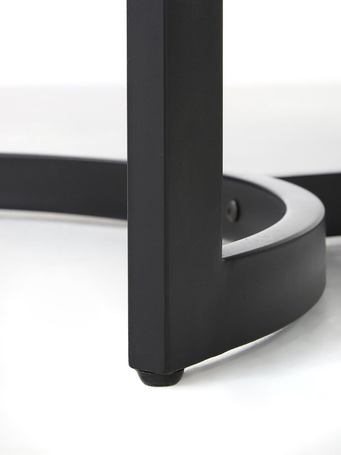 Supported by a sleek, powder-coated black metal frame with gracefully inward-curving ends for enhanced stability and foot space.