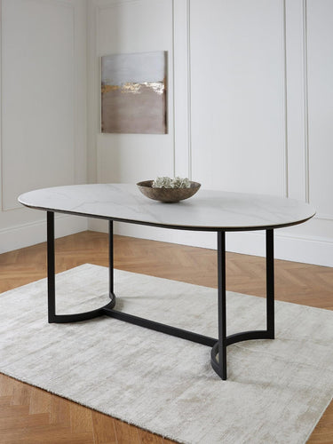Stunning in every way, the Alba oval dining table features a smoothly shaped ceramic top with a realistic marble-effect finish of grey veins and swirls on a white base. Easy to wipe clean, it's supported by a contemporary black metal base with inward-curving ends that provide generous leg room for end chairs. A dramatic, durable centrepiece for modern dining spaces. Self-assembly required.