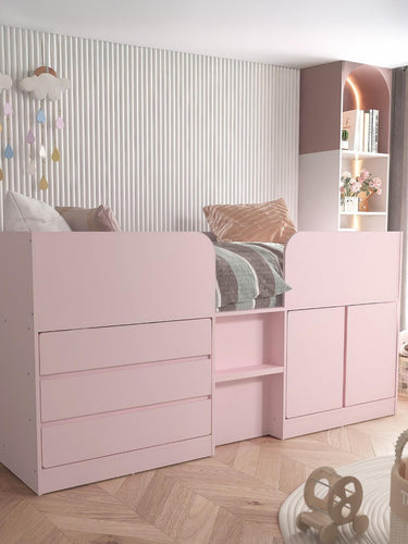 Bailey Mid Sleeper Bed Pink with Drawers and Cupboard Storage Kids