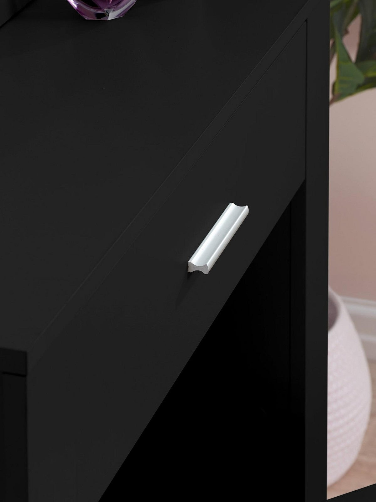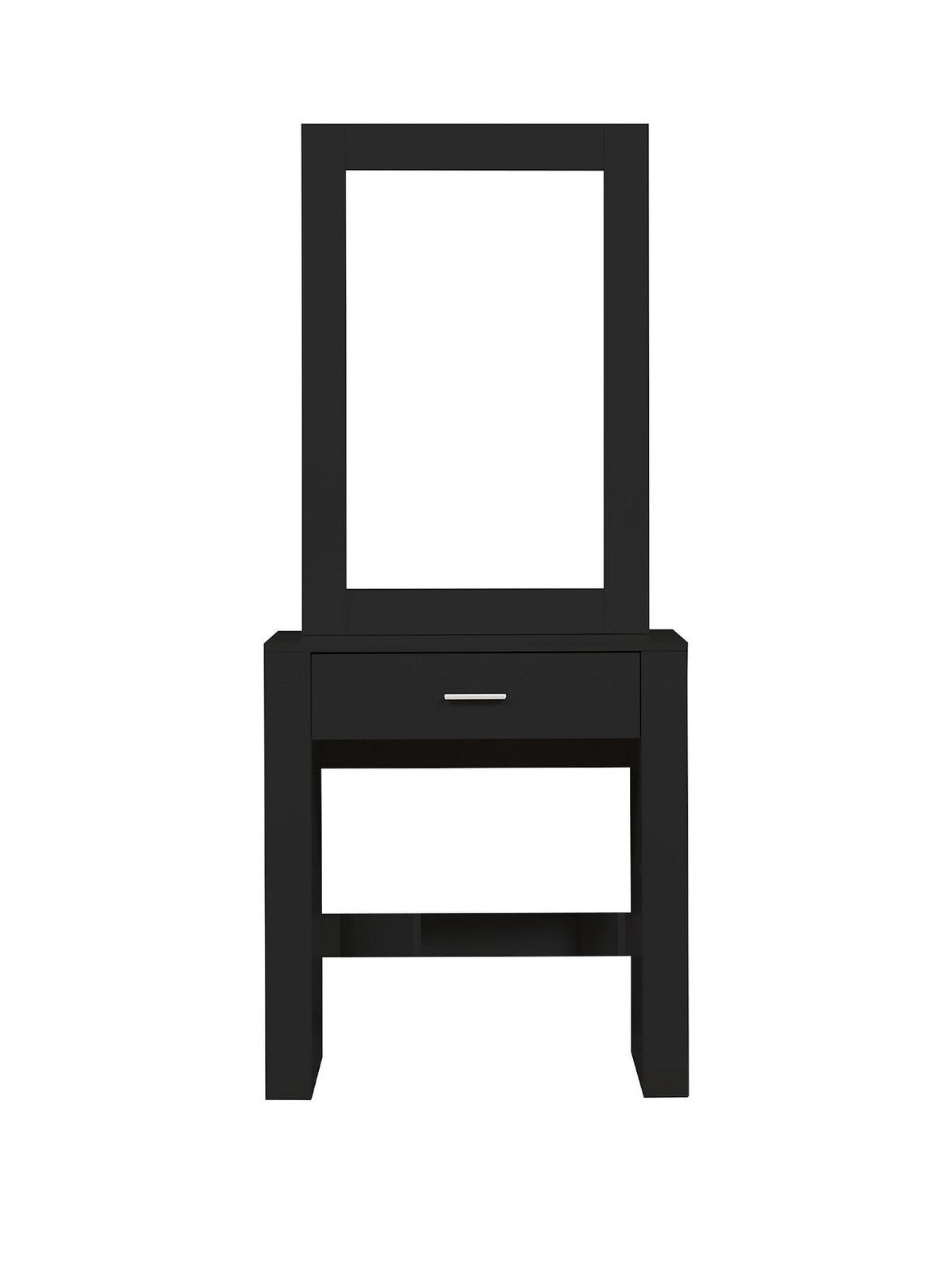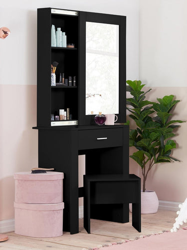 Discover the perfect blend of contemporary style and clever design with the Evelyn Sliding Mirror Dressing Table in sleek black. This elegant vanity features a large sliding mirror that reveals three hidden storage shelves, providing a discreet place for all your beauty essentials. Complete with a matching black stool, a spacious drawer, and a modern silhouette, it creates a stunning and organized focal point for your bedroom or dressing area.