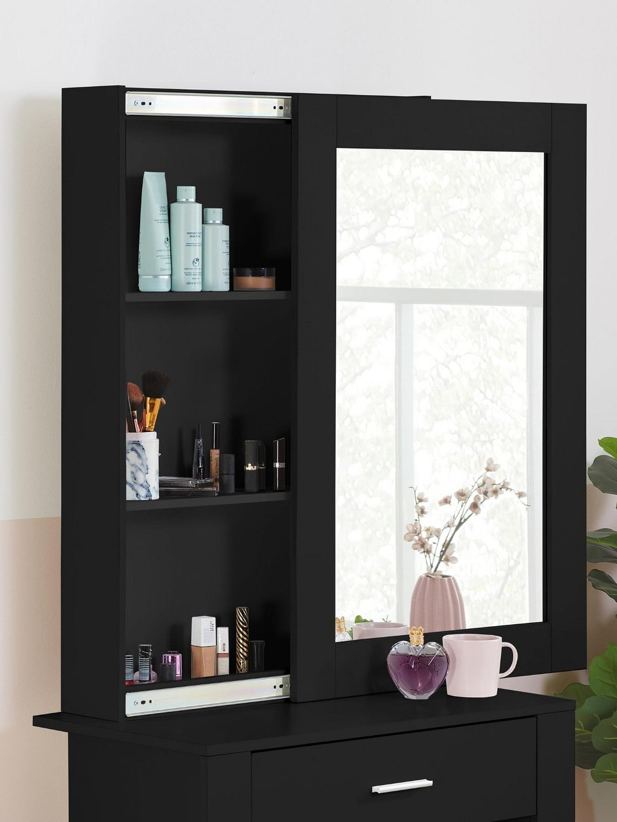 Three shelves behind the mirror keep cosmetics and accessories organized yet out of sight