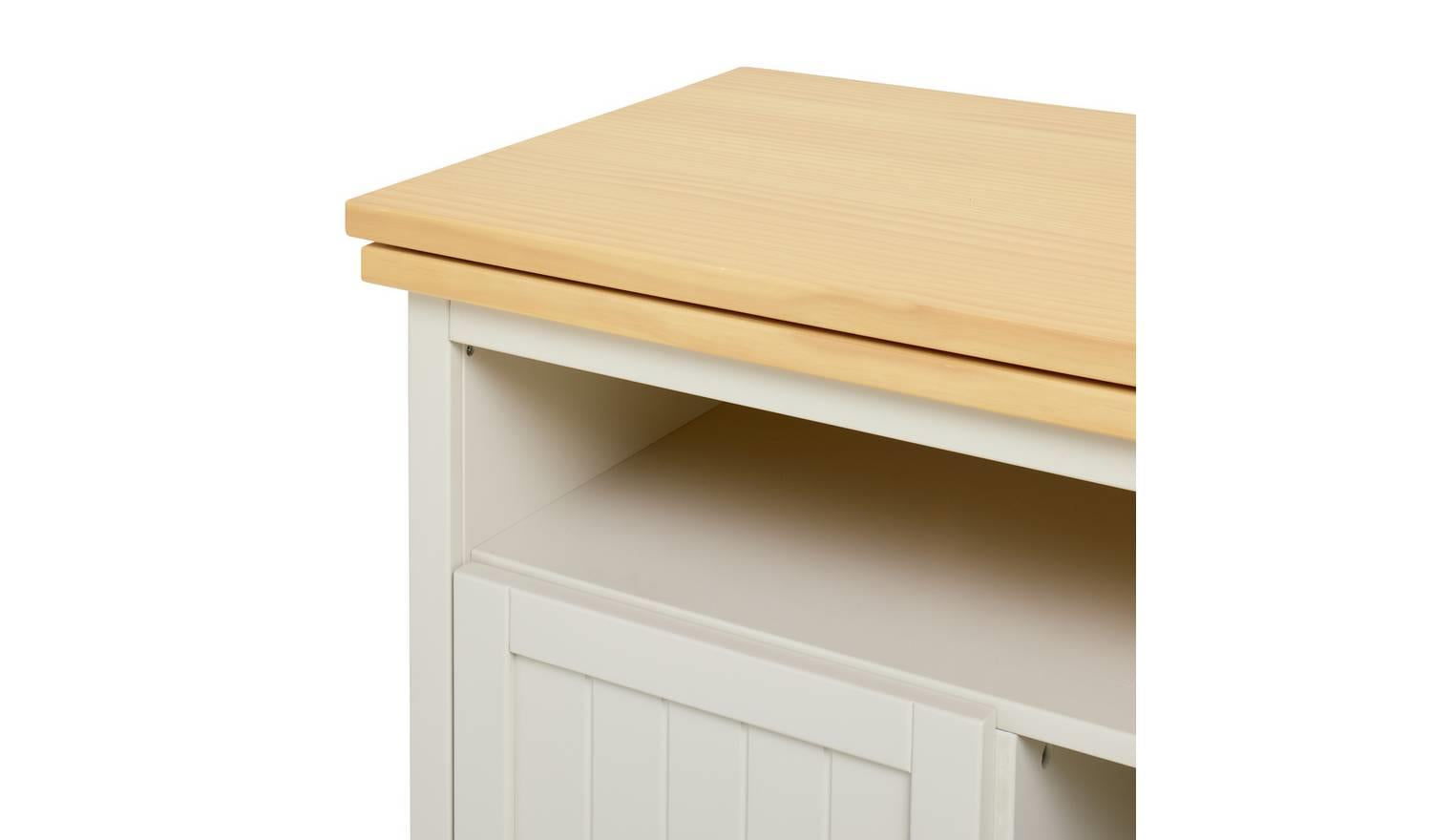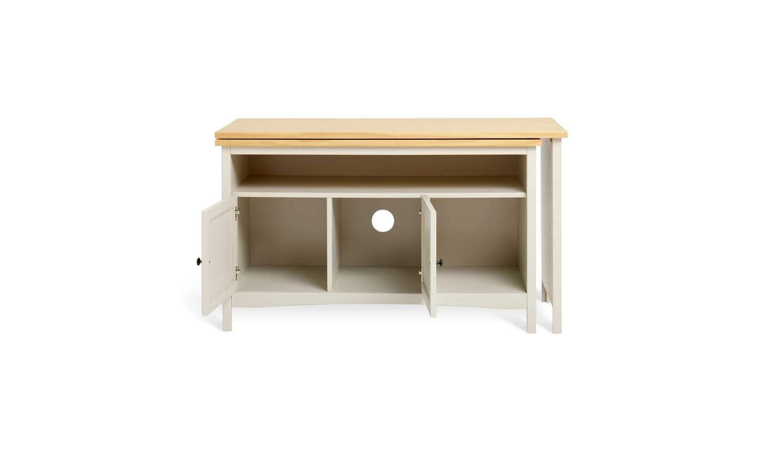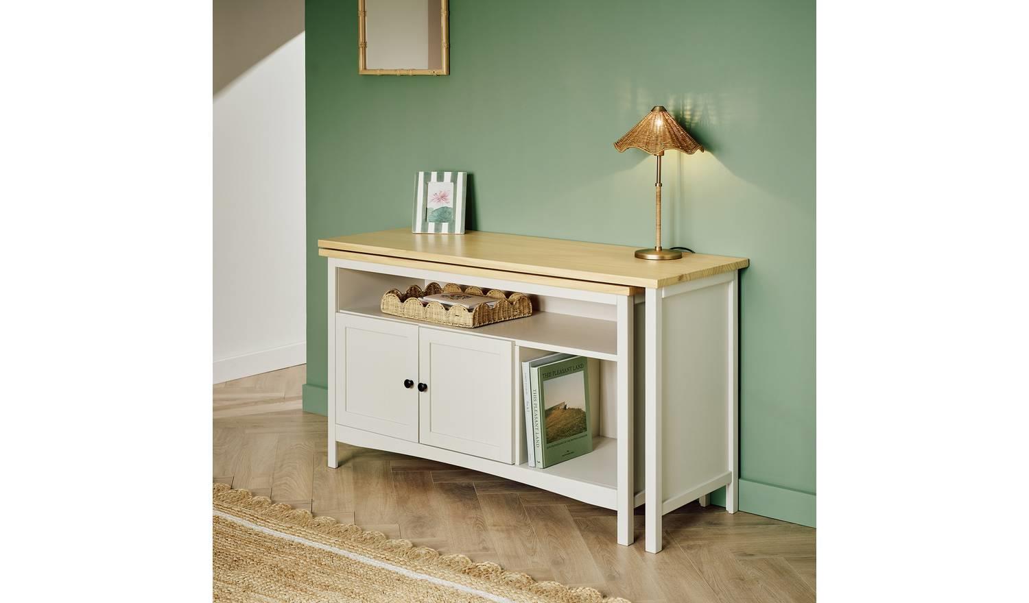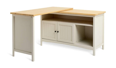 Now it's a sideboard. Now it's a desk. And all it takes is a swivel. What a clever piece of furniture this is. At first glance it's a handsome country style cabinet. All light beige paint and polished pine. But open it out and it instantly becomes a workstation with an ample sized desktop and plenty of chair space underneath. Storage is sorted too, with 1 cupboards, a shelf, and a cubby hole. A smart, space saving, multi-tasker with oodles of natural style.