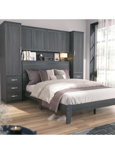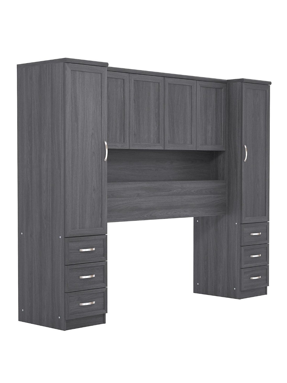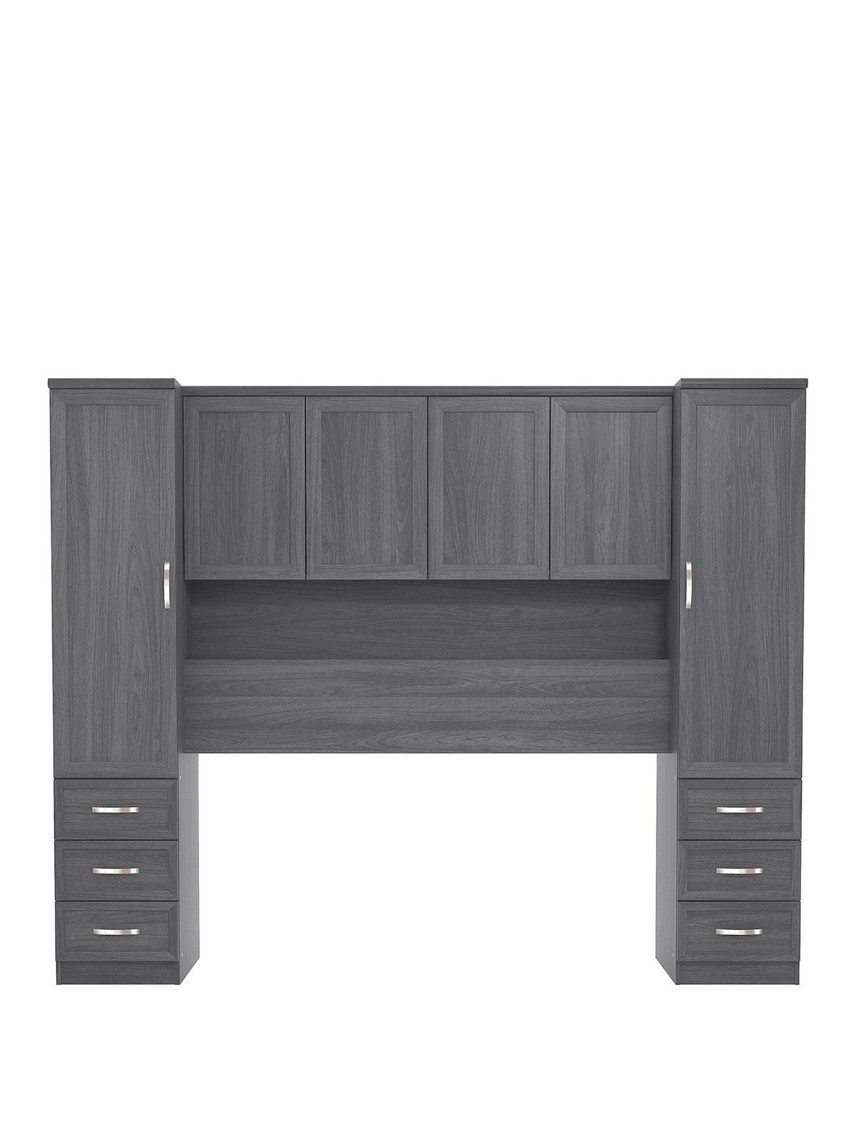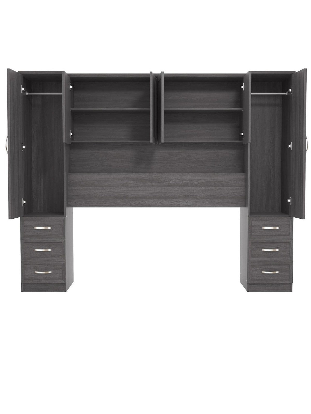 Each side boasts a wardrobe with metal hanging rail, as well as three drawers for keeping all those bedside essentials. Along the top are cupboards with internal shelving, while an open shelf allows you to show off as well as store - perfect for ornaments, pictures and more.