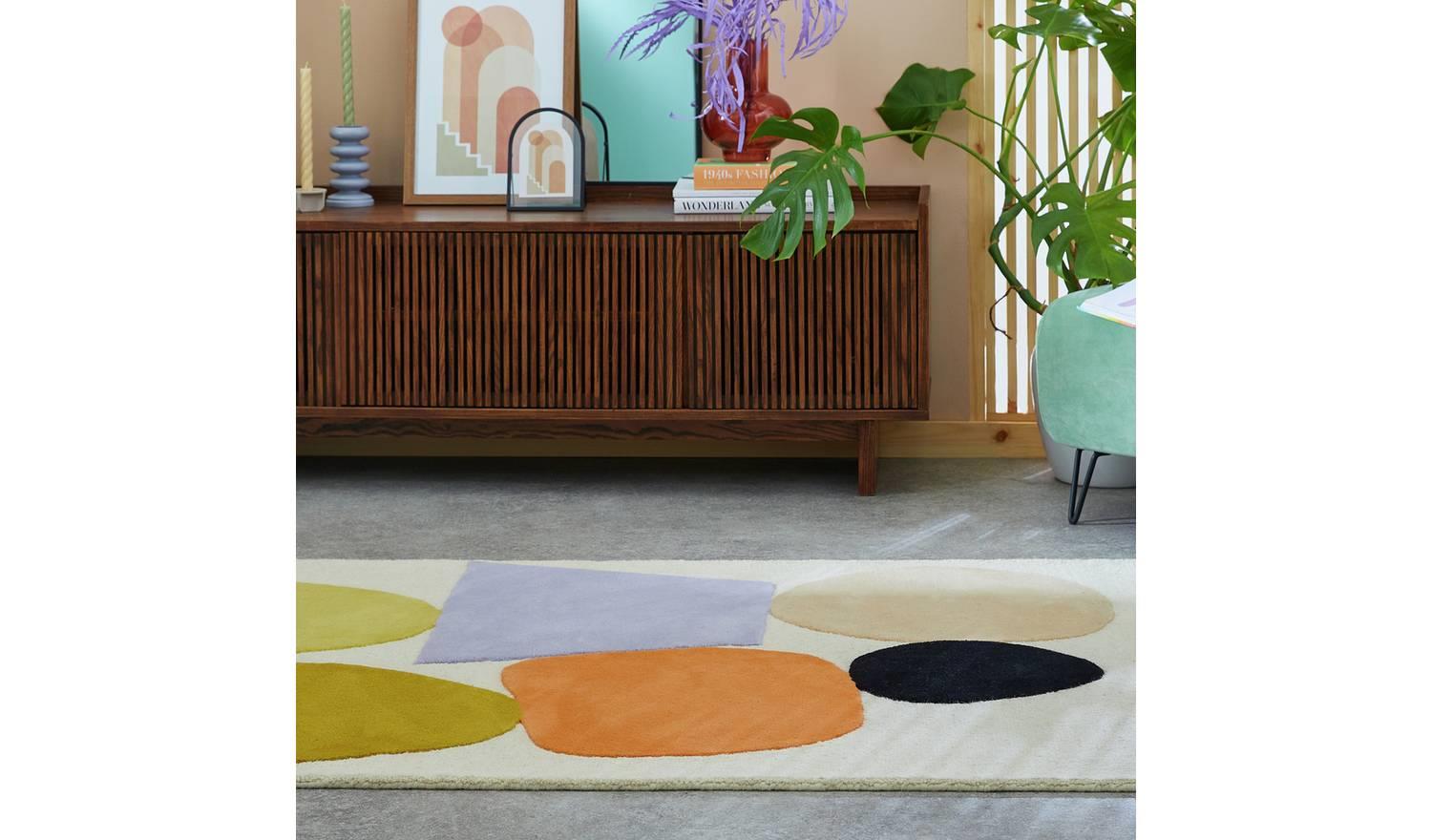 Get ready to make a bold statement with this modern geo rug. Strong shapes and muted colours sit beautifully on a cream background. A fabulous way to soften wooden floors or create a focal point in a room.