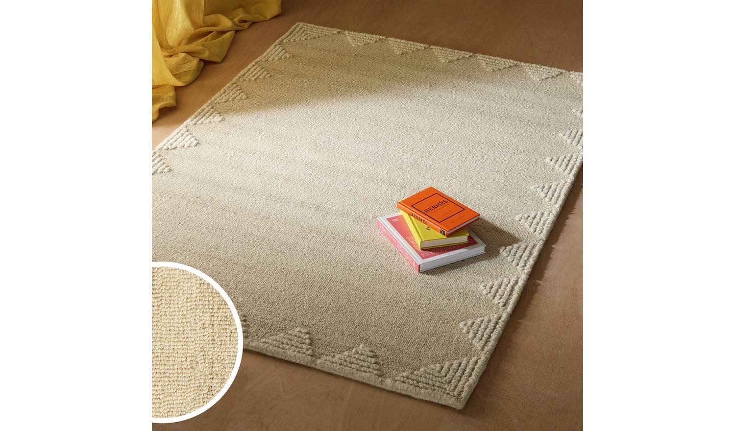 Delightfully tactile. Our Diamond Border rug showcases the beauty of pure 100% wool. Skilfully woven to reveal soft, uneven textures, it feels comforting underfoot. The geometric border adds structure and warmth, while natural tones are instantly welcoming. A simple way to bring charm and effortless character to living rooms or hallways.