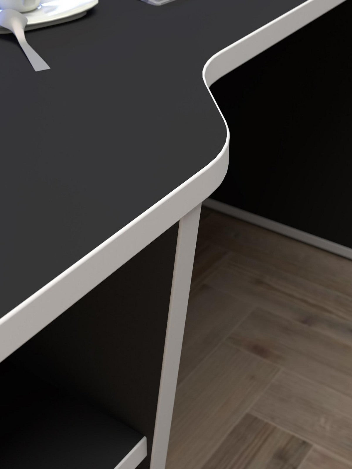 Elevate your gaming setup with the Dylan Gaming Desk, an ultra-modern command centre for marathon sessions. Featuring a wide 160cm scratch-resistant black desktop with contrasting white trim, integrated LED backlighting, and bold, sloped pedestals with open shelving, this desk combines aggressive style with serious functionality. Complete with a dedicated PC tower bay, cable management, and a raised screen shelf, it's designed to showcase your gear and enhance your gameplay.