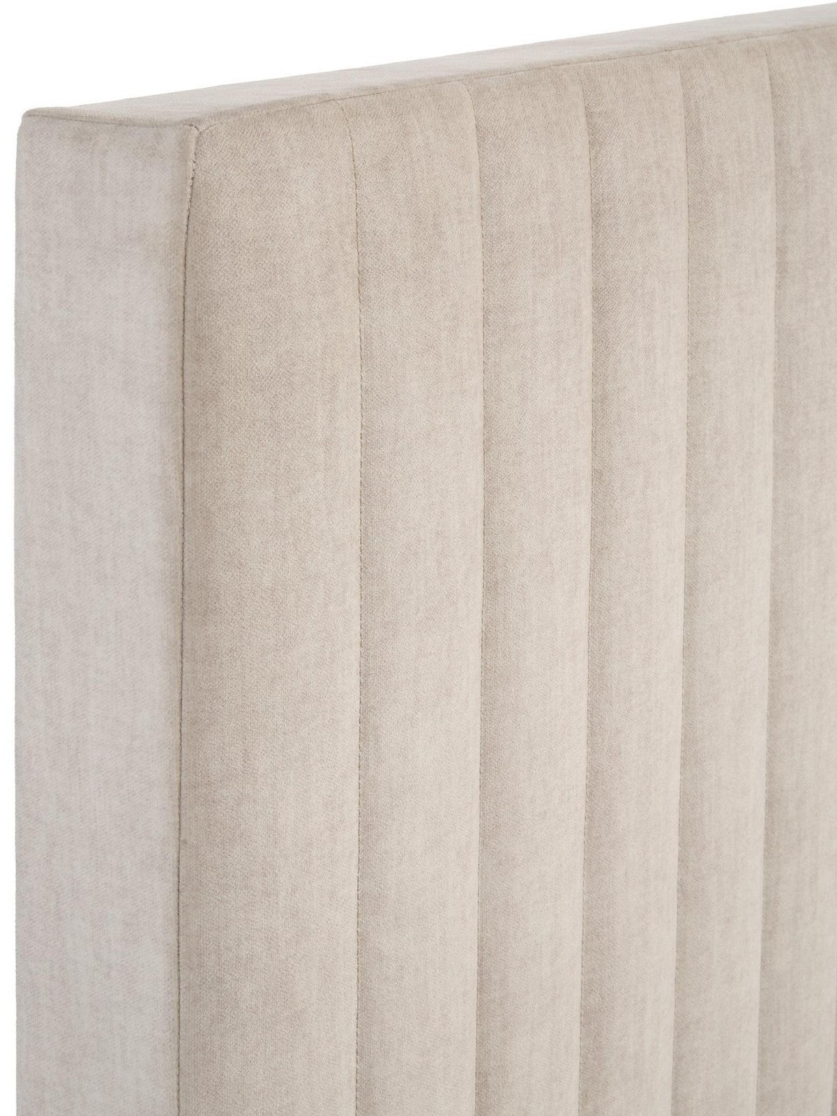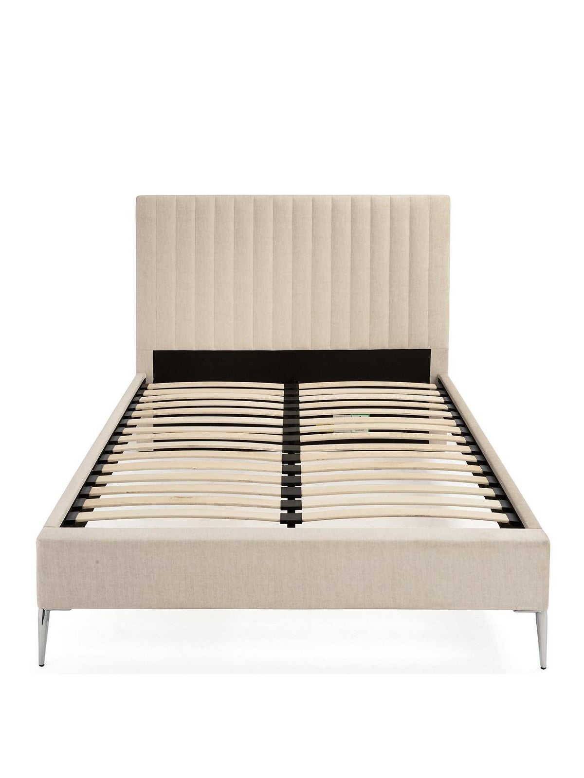 The Emelia Double Bed Frame in soft cream fabric combines luxurious comfort with contemporary style. Featuring a generously padded headboard with elegant vertical stitching, slim metal feet, and a low foot end, this bed brings a touch of modern sophistication to any bedroom while providing exceptional comfort through its sprung slat system.