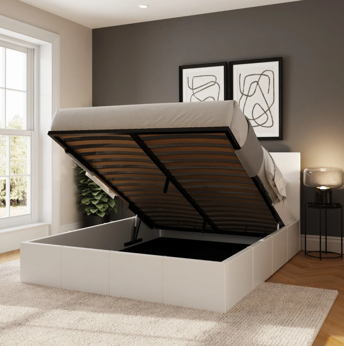 Modern Space-Saver: White Faux Leather Ottoman Bed with Gas Lift Storage