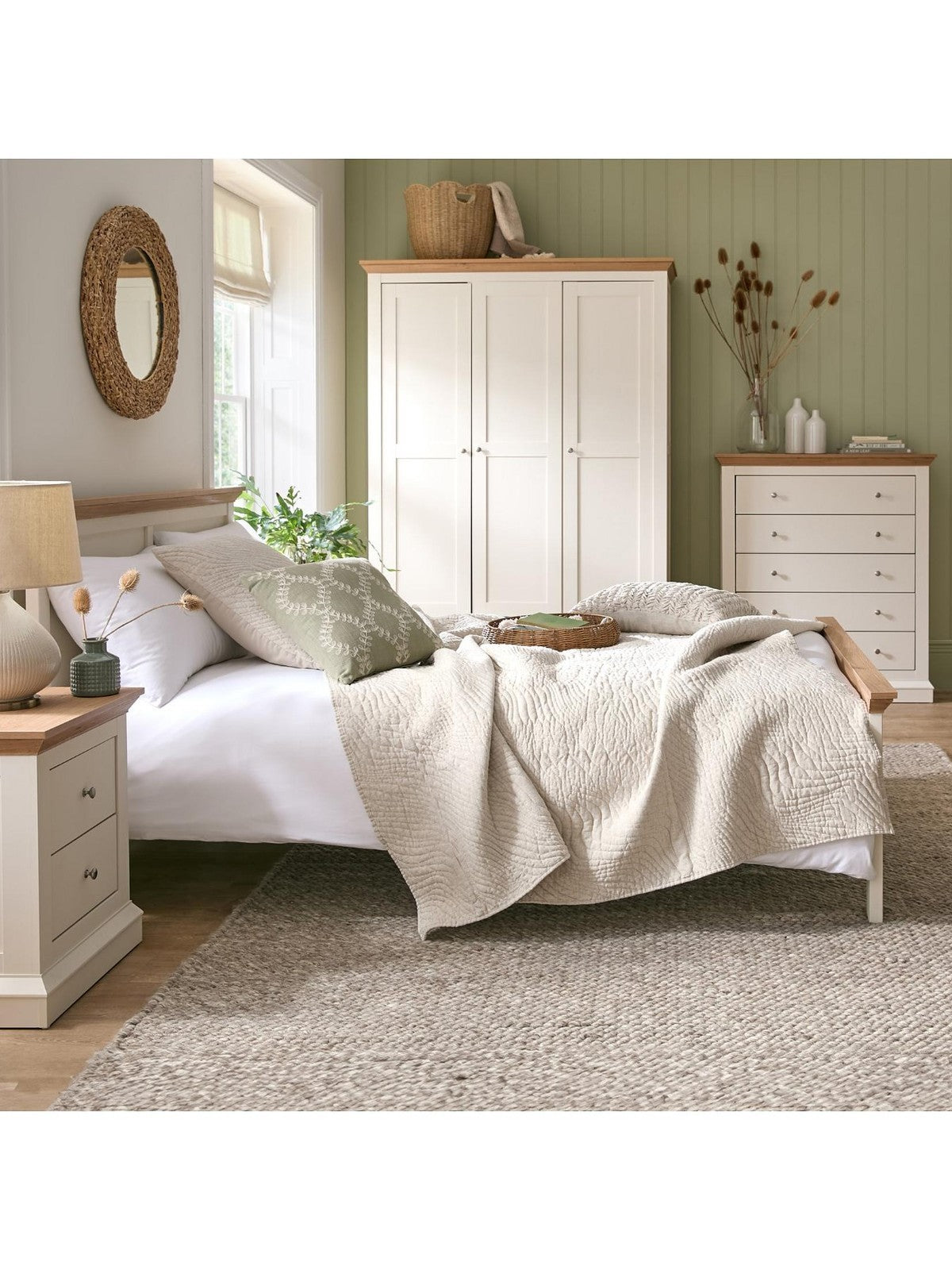Combines a painted cream base with a realistic oak-effect top for warm, countryside appeal