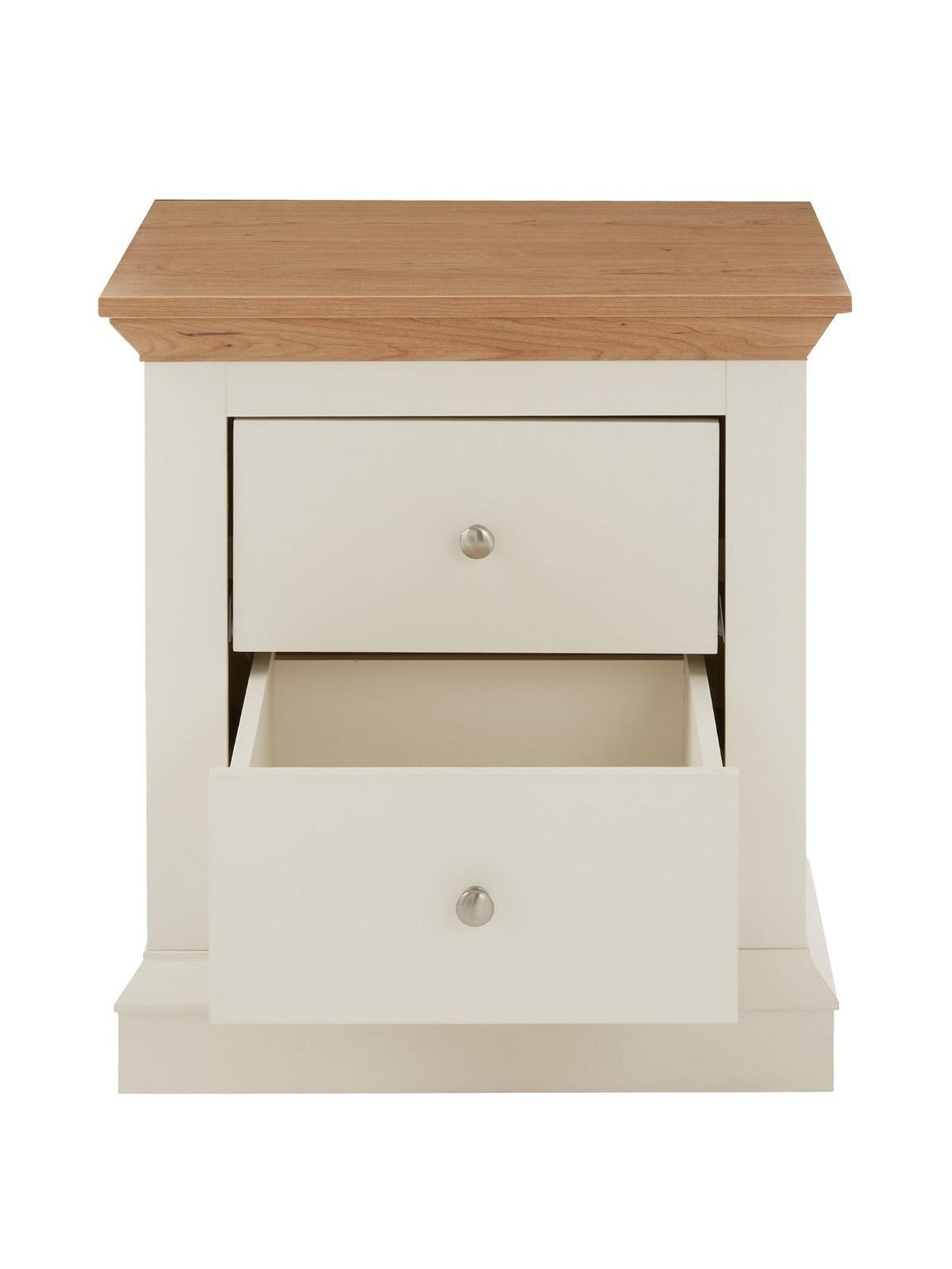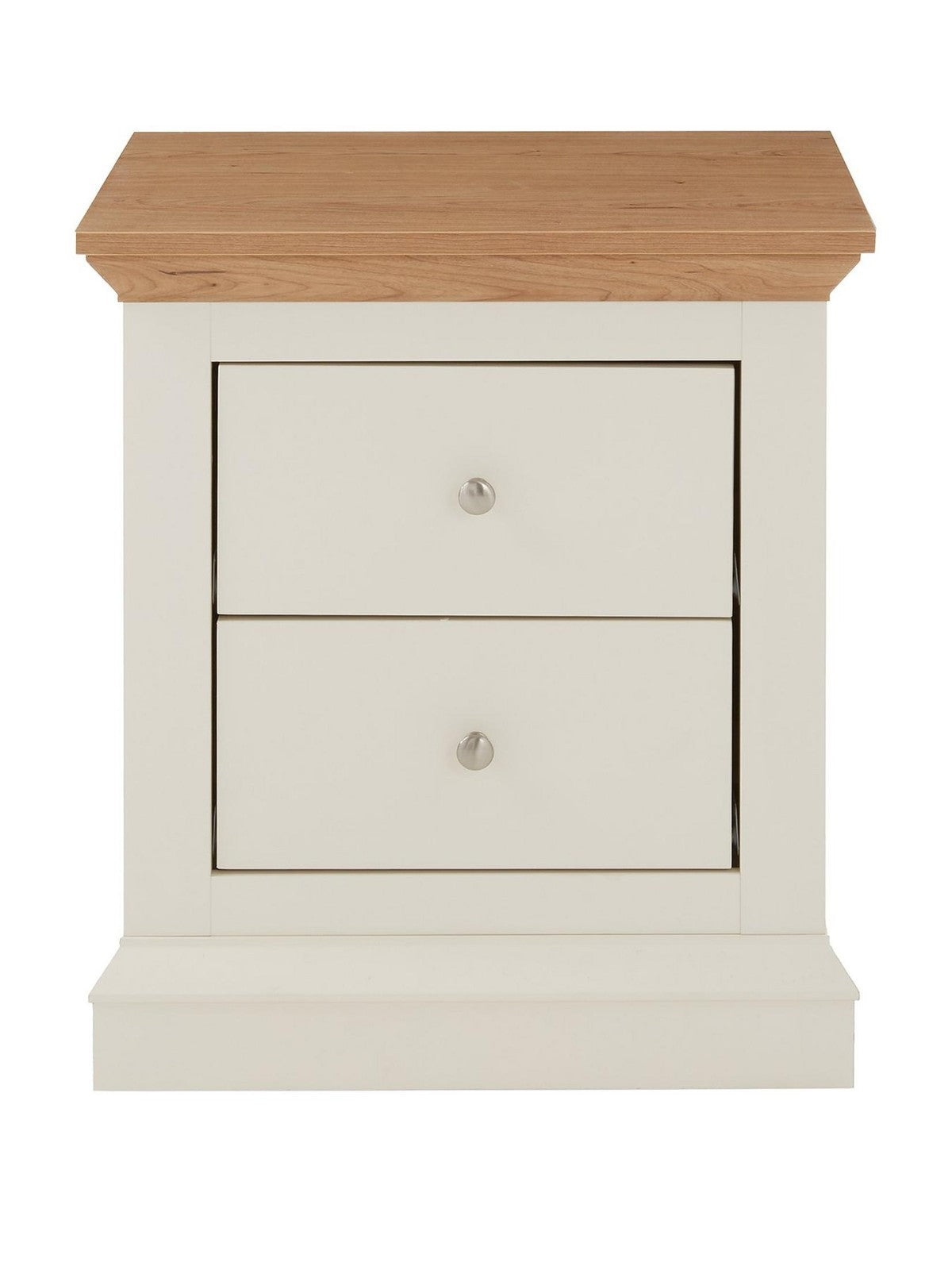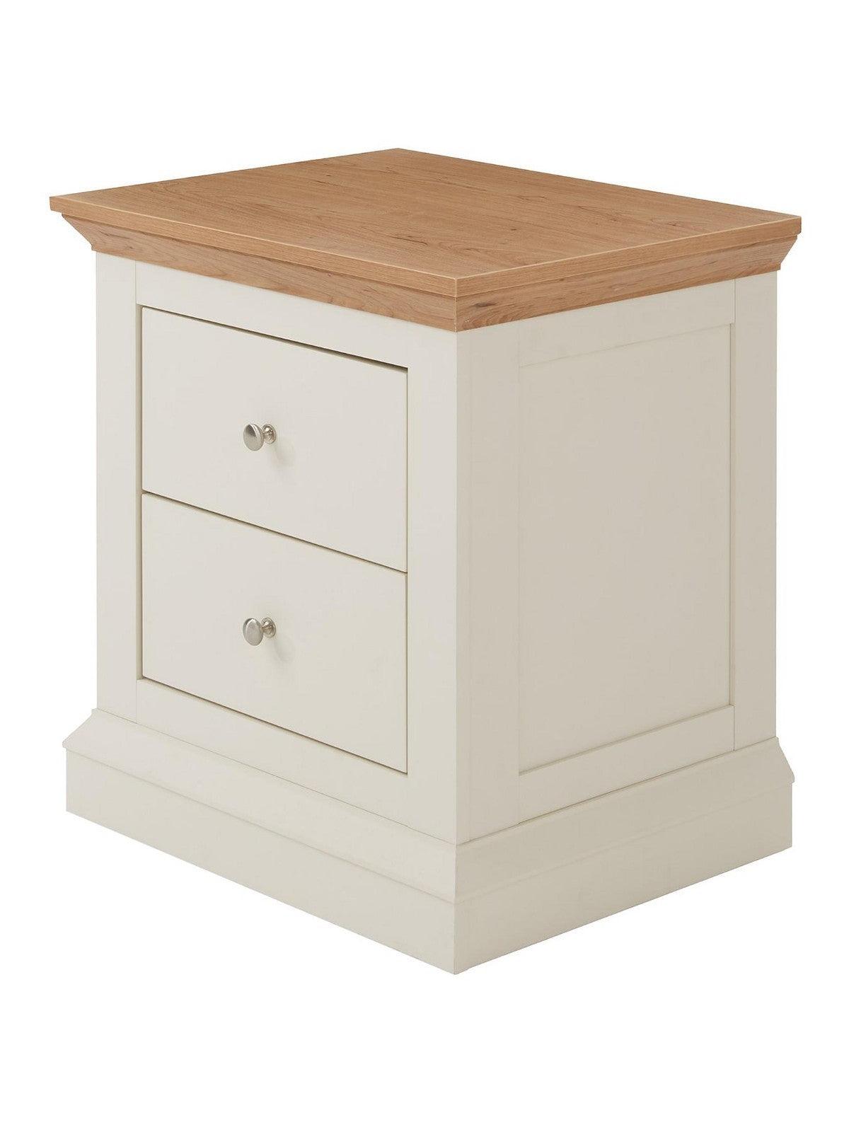 Introduce substantial, countryside charm to your bedroom with this matching pair of Hanna Bedside Chests. Featuring a beautiful blend of a painted cream body and a chunky oak-effect top with a distinctive sloped edge, these chests create an eye-catching rustic look. Each chest includes two smooth-gliding drawers with shiny metal handles, offering convenient storage while adding a touch of vintage-inspired elegance to both sides of your bed.