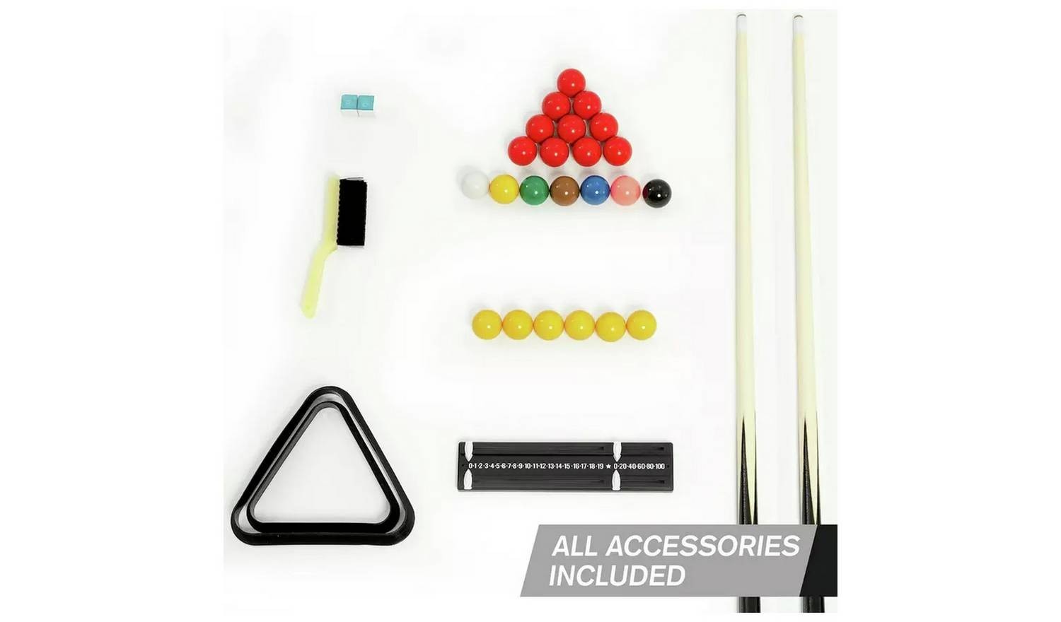 Comes with 44mm balls, triangle, cloth brush, chalk and scoreboard. Sturdy build supports consistent play while this collapsible design folds safely for storage. Quick self-assembly gets you playing with everything needed for games.