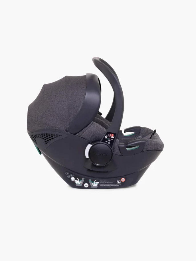 Drive with confidence knowing your little one is snug and secure in the iCandy Cocoon car seat. This i-Size compliant child restraint system is suitable from birth to 13kg and offers both seat belt and ISOFIX installation options. Featuring a unique handle design that securely locks onto pushchair adaptors, a multi-position canopy with UPF 50+ fabric, and a removable newborn insert. Complete with base included.
