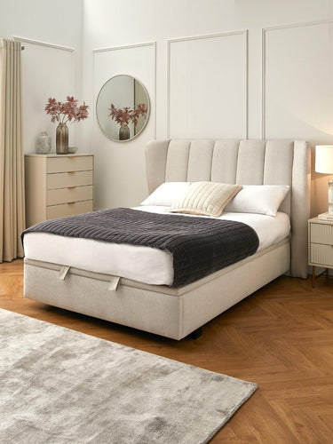 Enhance your bedroom with the Jasper Lift Up Storage Bed in elegant ivory. This beautifully upholstered double bed combines a sophisticated winged headboard with practical underbed storage, offering both style and functionality for the modern home. The sumptuous fabric and quilted stitching create a luxurious focal point, while the innovative storage base helps maintain a clutter-free space.