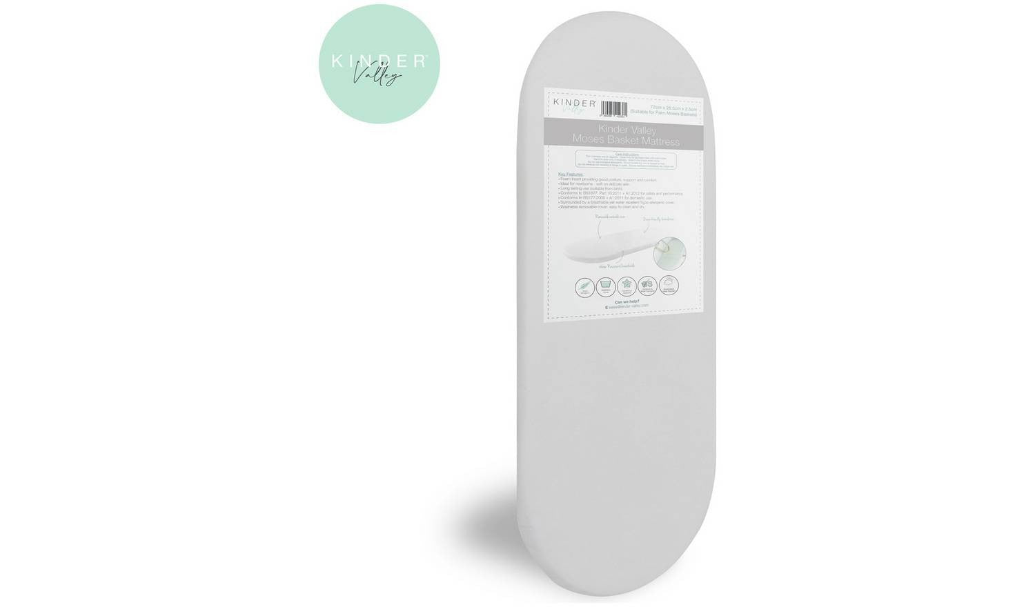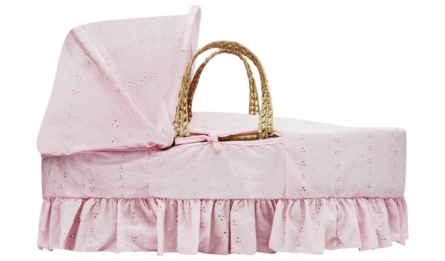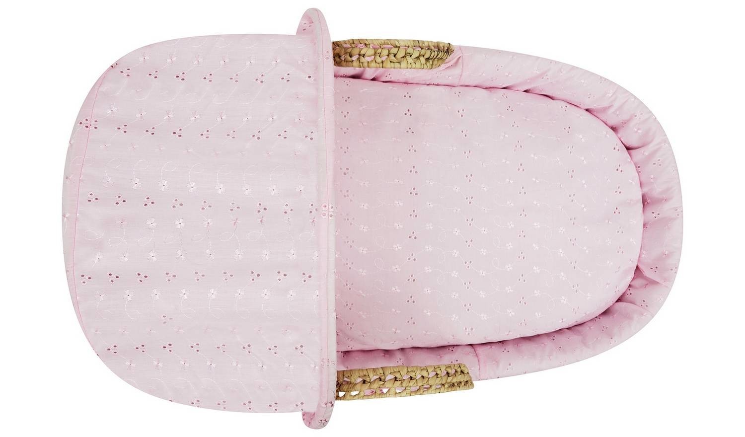 Fully lined cotton moses basket with adjustable hood, removable lining and mattress.