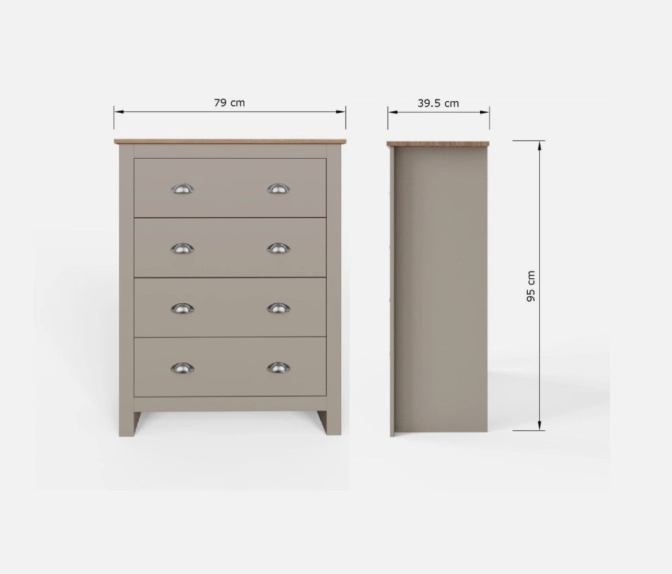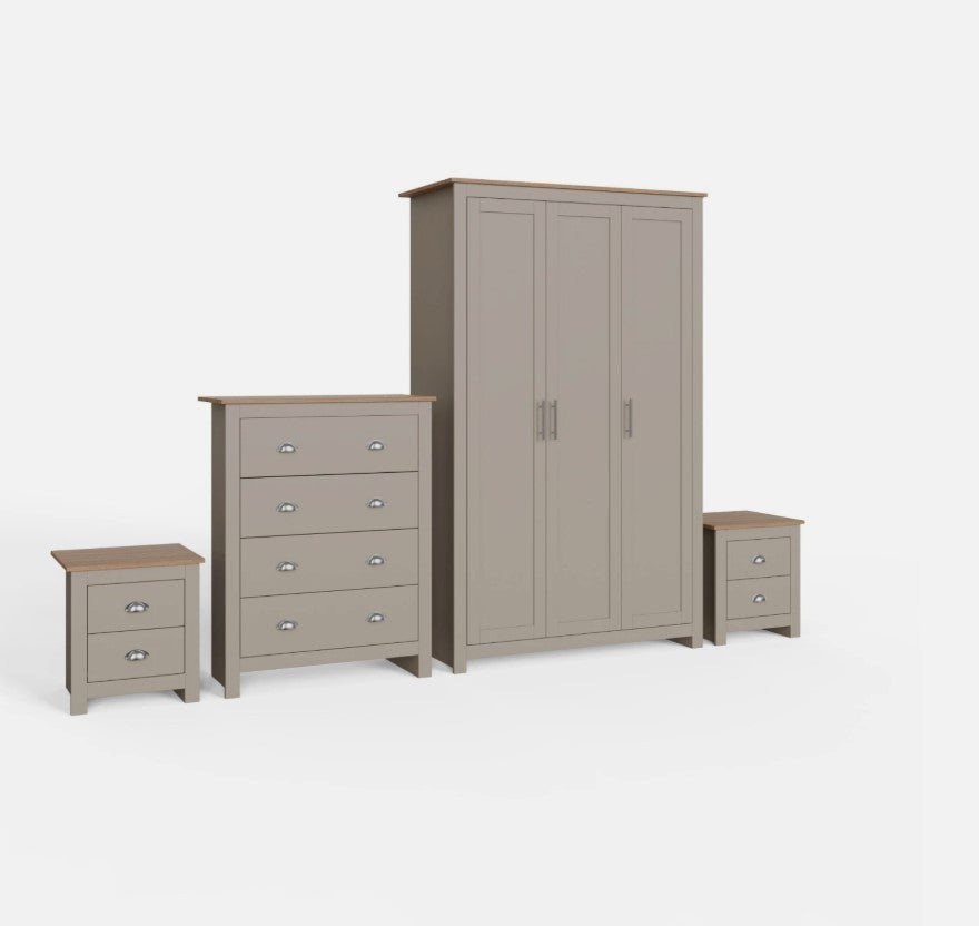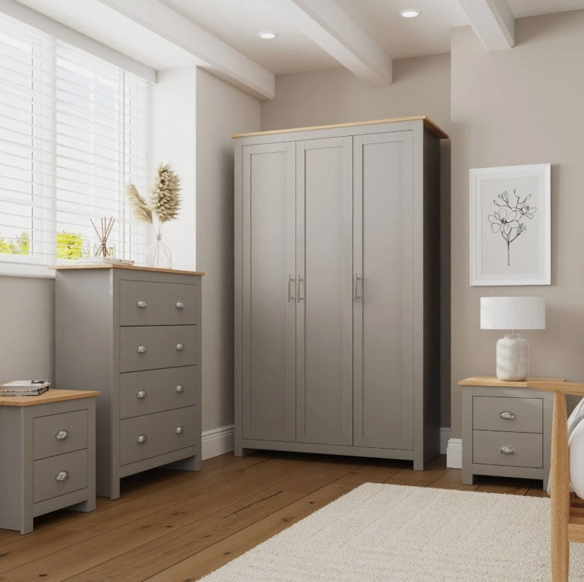 Kit out your bedroom in first-class style with this complete Lancaster 4-piece bedroom set. Featuring a sophisticated shaker-inspired design with a soft grey foiled finish, contrasting oak-effect tops, and brushed steel handles. The set includes a spacious 3-door wardrobe with hanging rail and shelves, a 4-drawer chest, and two 2-drawer bedside tables for comprehensive storage. Self-assembly required.