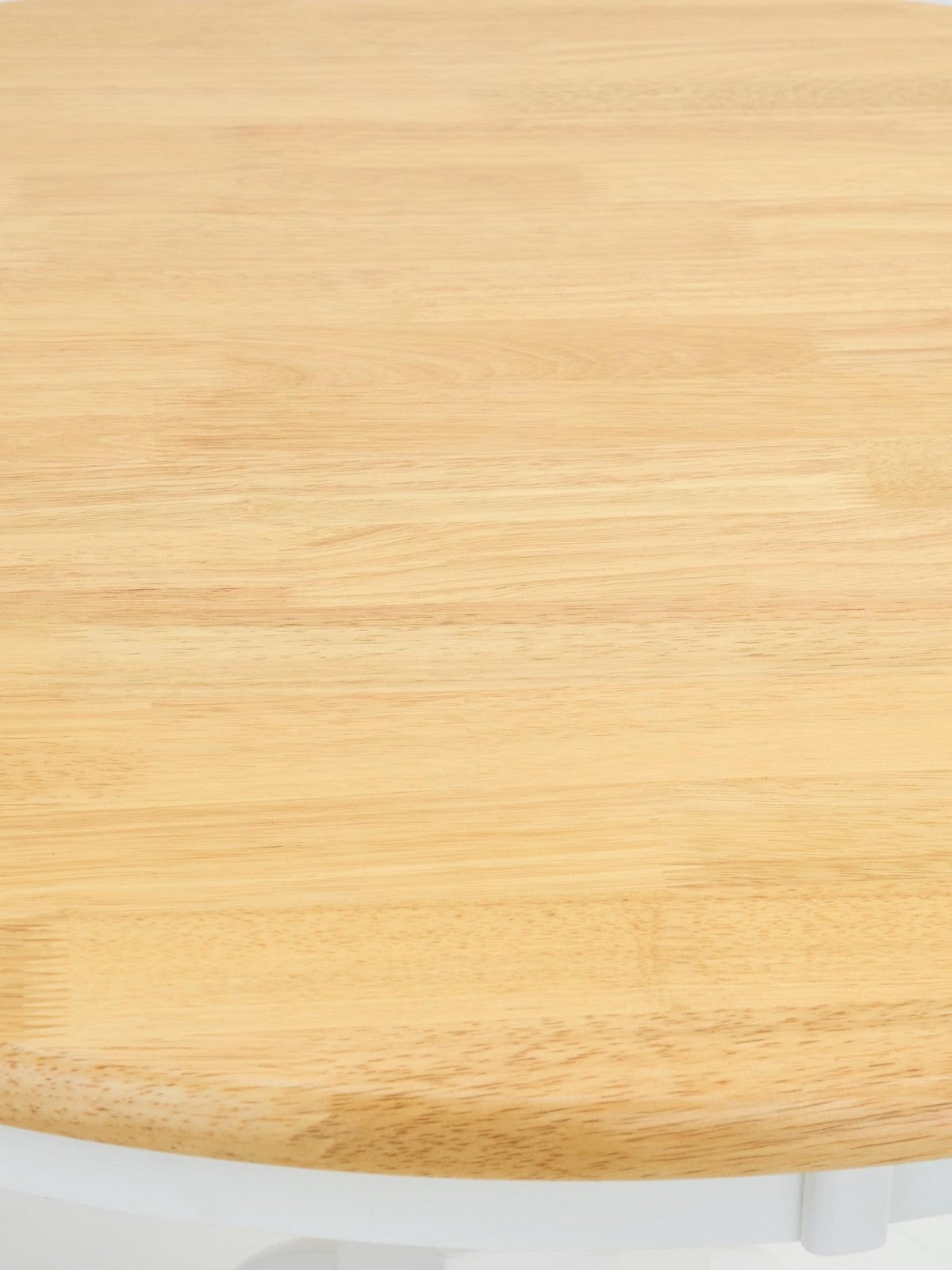 The circular tabletop is crafted from solid, wonderfully grained rubberwood in a warm oak finish for lasting natural beauty.