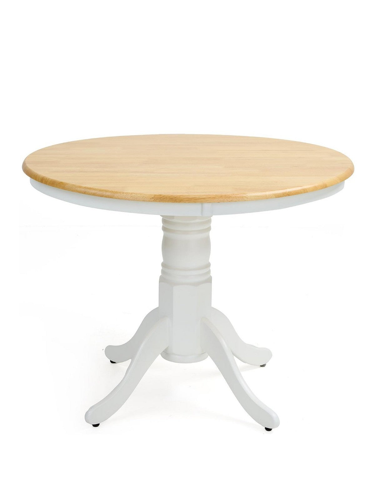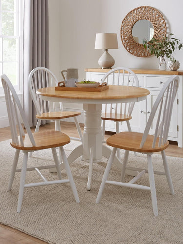 Bring inviting farmhouse style to your dining space with this complete Kentucky 5-piece set. Featuring a charming 100cm circular solid rubberwood tabletop in a wonderfully grained oak finish, set on a white chunky turned pedestal with curvy feet. Includes four matching spindle-back chairs with striking rubberwood seats and white frames. Comfortably seats four. Self-assembly required.