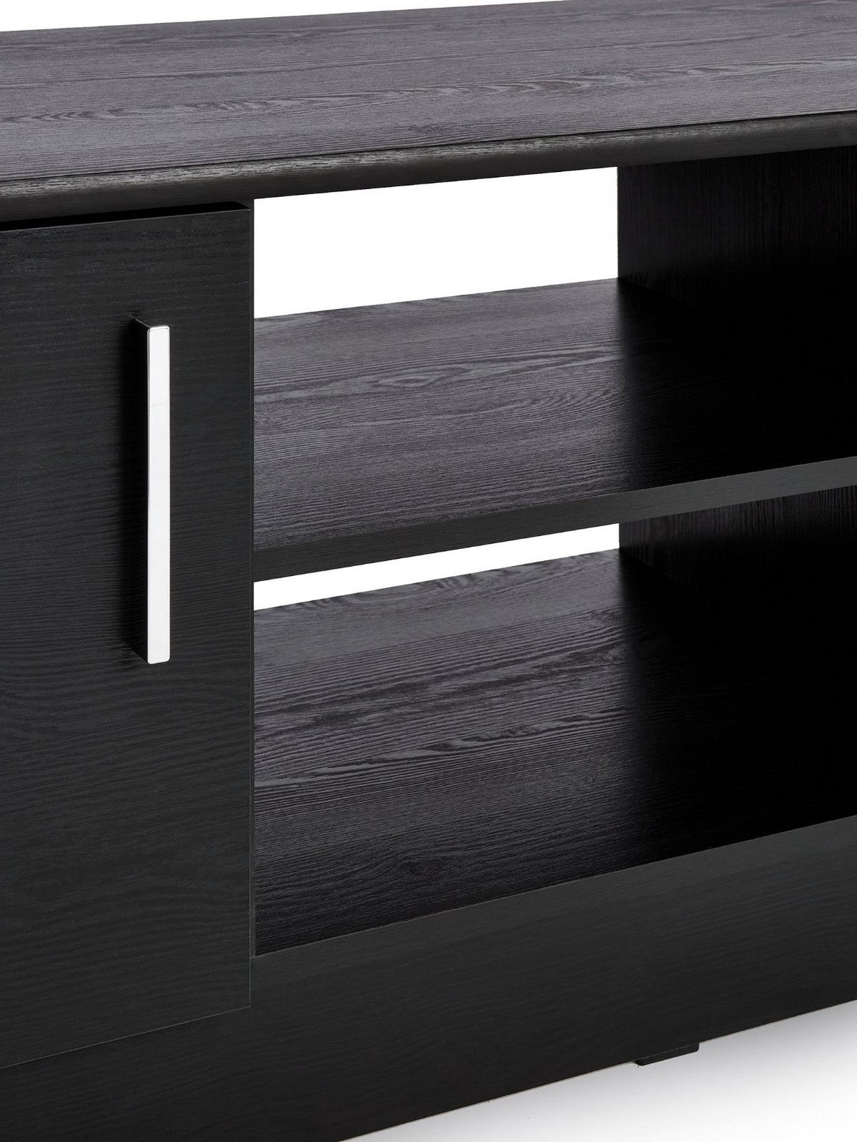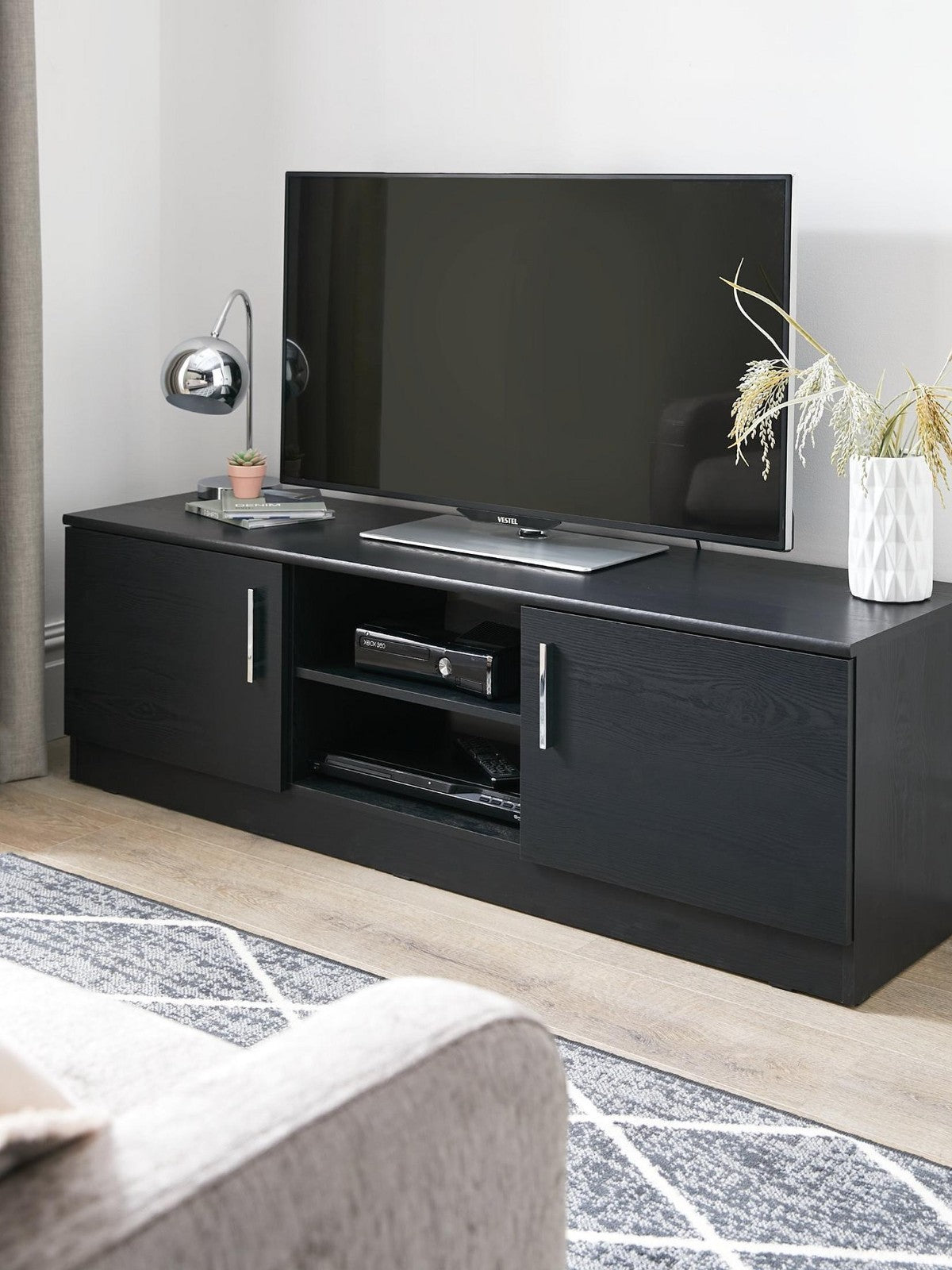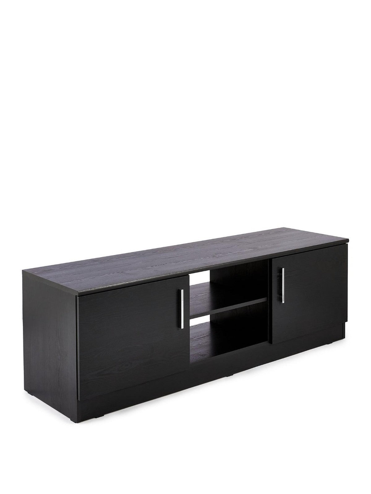 Showcase your entertainment setup with this brilliantly priced Panama TV Stand in contemporary black. Designed to support televisions up to 55 inches, this sleek unit features two storage cupboards with designer metal bar handles for hiding away games and media, plus open central shelving for easy access to consoles and set-top boxes. With a practical open back for cable management and a stylish wood-effect finish, it delivers modern functionality at an exceptional value.
