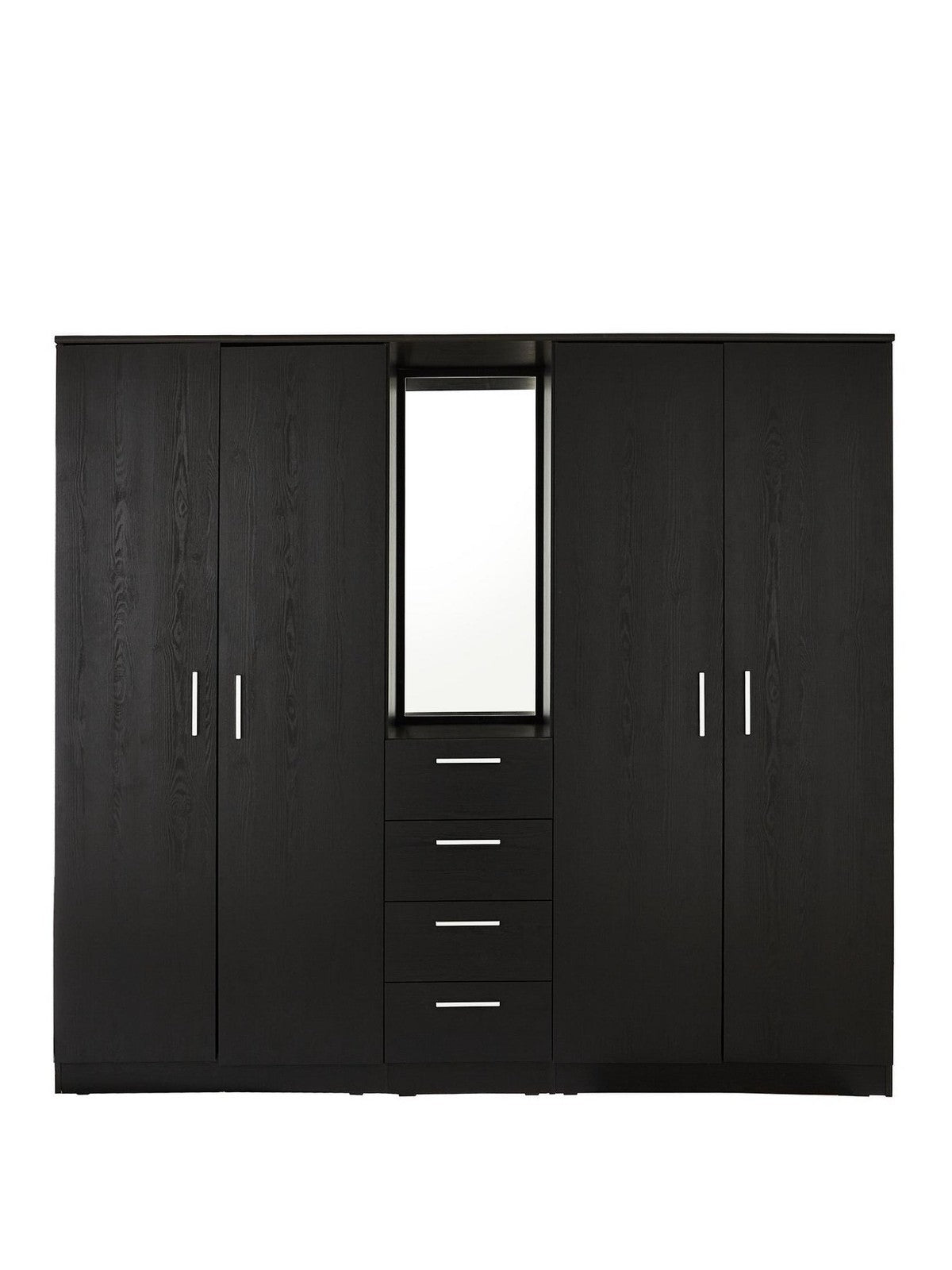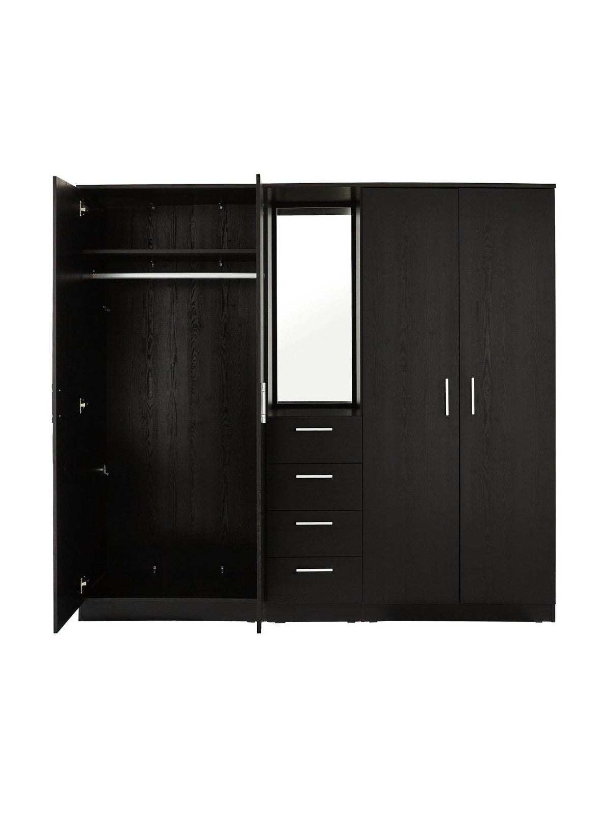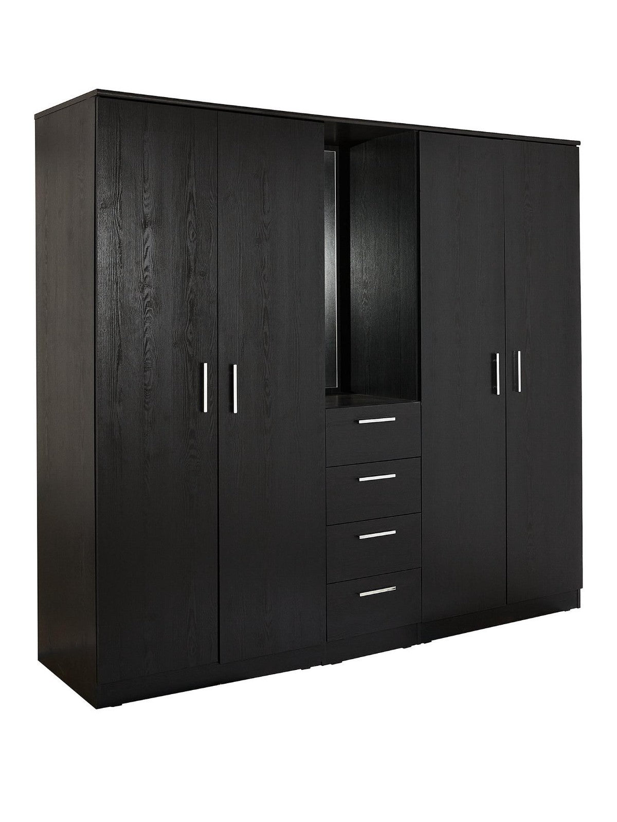 This Panama combi wardrobe offers great value and modern functionality. In a black wood-effect finish, it provides two side compartments with hanging rails and high shelves, a central section with four smooth-gliding drawers, and an open section with a full-length mirror. Finished with sleek metal handles and a matching interior, it delivers versatile storage and daily convenience. Made with responsibly sourced materials. Self-assembly required.