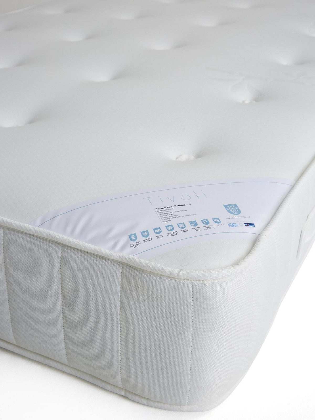 The Tivoli Ortho mattress provides reliable orthopaedic support for a restful night's sleep. It features a supportive open coil spring system layered with quality fillings for comfort and durability. The mattress is finished with a soft, breathable 100% polyester knit stretch cover and includes convenient turning handles for easy maintenance. Air vents promote freshness, and its medium-firm feel offers balanced comfort and support.